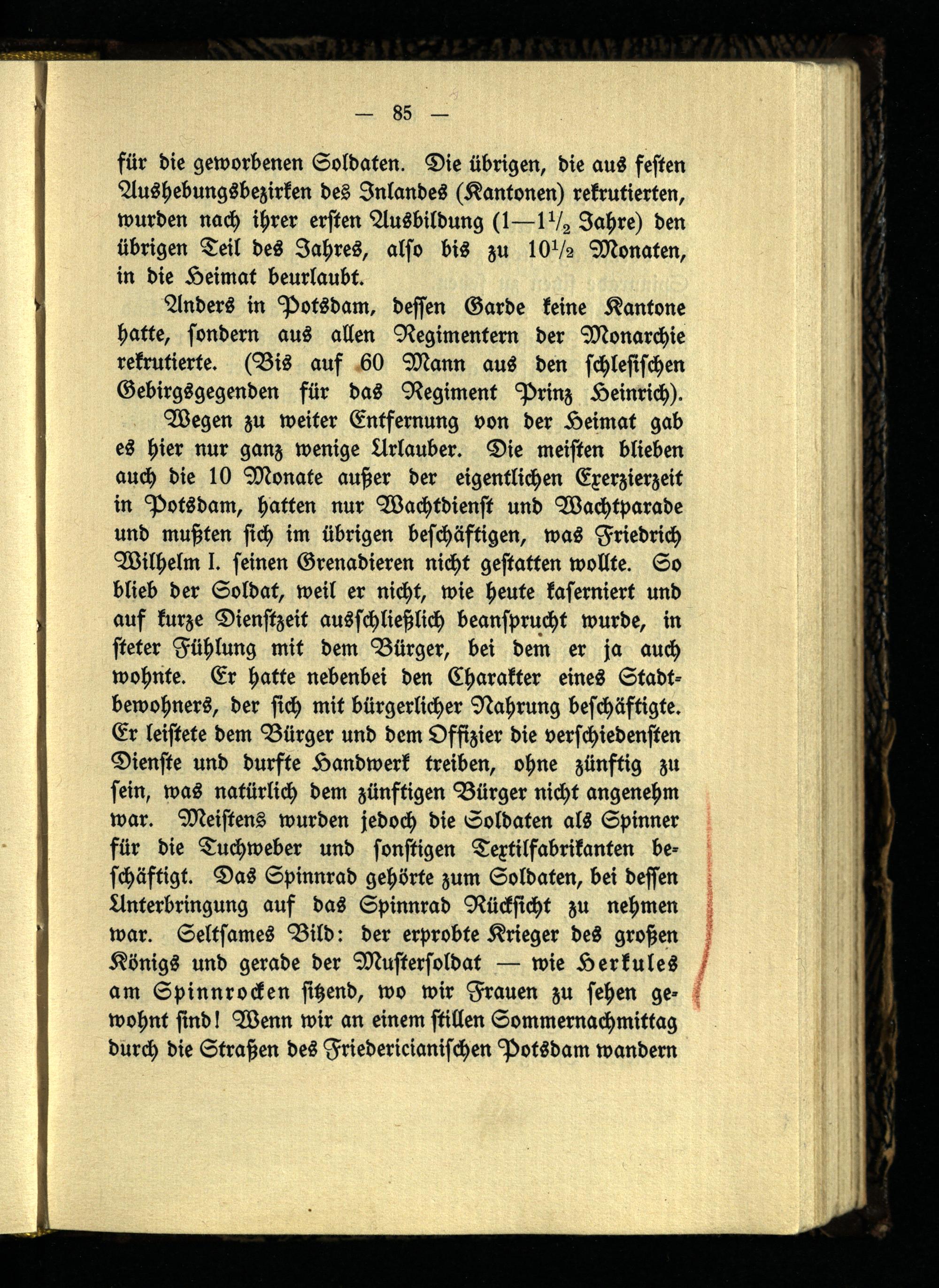 Wegen zu weiter Entfernung von der Heimat gab es hier nur ganz wenige Urlauber. Die meisten blieben auch die 10 Monate außer der eigentlichen Exerzierzeit in Potsdam, hatten nur Wachtdienst und Wachtparade und mußten sich im übrigen beschäftigen, was Friedrich Wilhelm I. seinen Grenadieren nicht gestatten wollte. So blieb der Soldat, weil er nicht, wie heute kaserniert und auf kurze Dienstzeit ausschließlich beansprucht wurde, in steter Fühlung mit dem Bürger, bei dem er ja auch wohnte. Er hatte nebenbei den Charakter eines Stadtbewohners, der sich mit bürgerlicher Nahrung beschäftigte. Er leistete dem Bürger und dem Offizier die verschiedensten Dienste und durfte Handwerk treiben, ohne zünftig zu sein, was natürlich dem zünftigen Bürger nicht angenehm war. Meistens wurden jedoch die Soldaten als Spinner für die Tuchweber und sonstigen Textilfabrikanten beschäftigt. Das Spinnrad gehörte zum Soldaten, bei dessen Unterbringung auf das Spinnrad Rücksicht zu nehmen war. Seltsames Bild: der erprobte Krieger des großen Königs und gerade der Mustersoldat — wie Herkules am Spinnrocken sitzend, wo wir Frauen zu sehen gewohnt sind! Wenn wir an einem stillen Sommernachmittag durch die Straßen des Friedericianischen Potsdam wandern