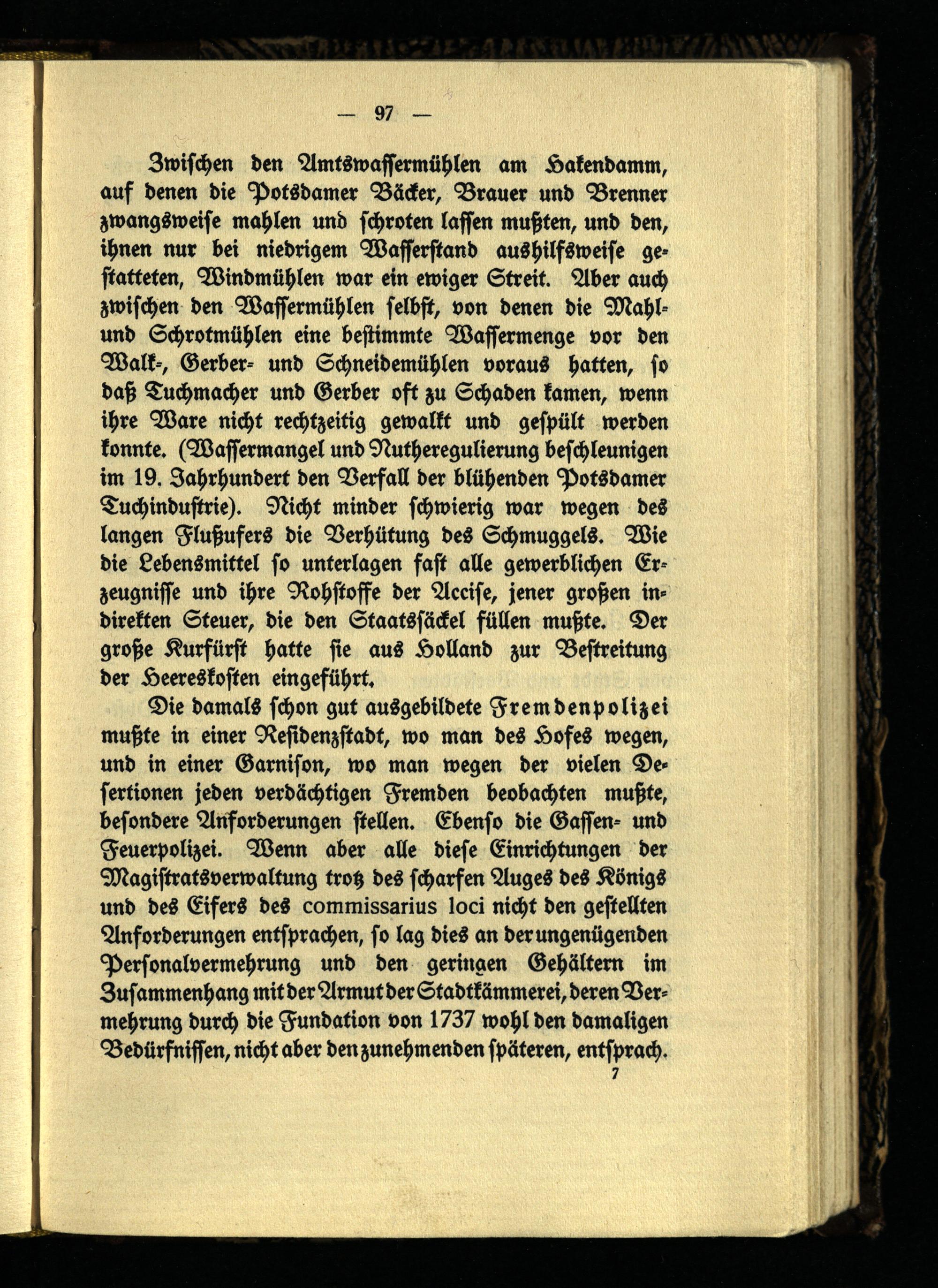 Zwischen den Amtswassermühlen am Hakendamm, auf denen die Potsdamer Bäcker, Brauer und Brenner zwangsweise mahlen und schroten lassen mußten, und den, ihnen nur bei niedrigem Wafferstand aushilfsweise gestatteten, Windmühlen war ein ewiger Streit. Aber auch zwischen den Wassermühlen selbst, von denen die Mahl- und Schrotmühlen eine bestimmte Wassermenge vor den Walk-, Gerber- und Schneidemühlen voraus hatten, so daß Tuchmacher und Gerber oft zu Schaden kamen, wenn ihre Ware nicht rechtzeitig gewalkt und gespült werden konnte. (Wassermangel und Nutheregulierung beschleunigen im 19. Jahrhundert den Verfall der blühenden Potsdamer Tuchindustrie). Nicht minder schwierig war wegen des langen Flußufers die Verhütung des Schmuggels. Wie die Lebensmittel so unterlagen fast alle gewerblichen Erzeugnisse und ihre Rohstoffe der Accise, jener großen indirekten Steuer, die den Staatssäckel füllen mußte. Der große Kurfürst hatte sie aus Holland zur Bestreitung der Heereskosten eingeführt.