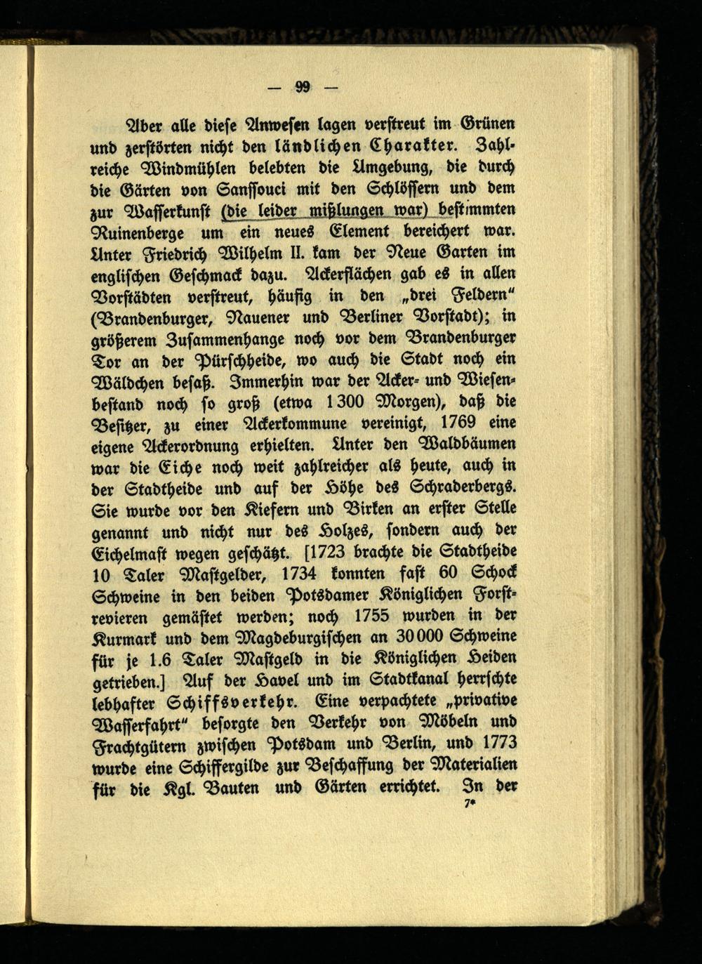 Aber alle diese Anwesen lagen verstreut im Grünen und zerstörten nicht den ländlichen Charakter. Zahl- reiche Windmühlen belebten die Umgebung, die durch die Gärten von Sanssouci mit den Schlössern und dem zur Wasserkunst (die leider miß lun gen war) bestimmten Ruinenberge um ein neues Element bereichert war. Unter Friedrich Wilhelm II. kam der Neue Garten im englischen Geschmack dazu. Ackerflächen gab es in allen Vorstädten verstreut, häufig in den „drei Feldern" (Brandenburger, Nauener und Berliner Vorstadt); in größerem Zusammenhangs noch vor dem Brandenburger Tor an der Pürschheide, wo auch die Stadt noch ein Wäldchen besaß. Immerhin war der Acker- und Wiesenbestand noch so groß (etwa 1300 Morgen), daß die Besitzer, zu einer Ackerkommune vereinigt, 1769 eine eigene Ackerordnung erhielten. Unter den Waldbäumm war die Eiche noch weit zahlreicher als heute, auch in der Stadtheide und auf der Höhe des Schraderbergs. Sie wurde vor den Kiefern und Birken an erster Stelle genannt und nicht nur des Holzes, sondern auch der Eichelmast wegen geschätzt. [1723 brachte die Stadtheide 10 Taler Mastgelder, 1734 konnten fast 60 Schock Schweine in den beiden Potsdamer Königlichen Forstrevieren gemästet werden; noch 1755 wurden in der Kurmark und dem Magdeburgischen an 30000 Schweine für je 1.6 Taler Mastgeld in die Königlichen Heiden getrieben.] Auf der Havel und im Stadtkanal herrschte lebhafter Schiffsverkehr. Eine verpachtete „privative Wasserfahrt" besorgte den Verkehr von Möbeln und Frachtgütern zwischen Potsdam und Berlin, und 1773 wurde eine Schiffergilde zur Beschaffung der Materialien für die Kgl. Bauten und Gärten errichtet. In der