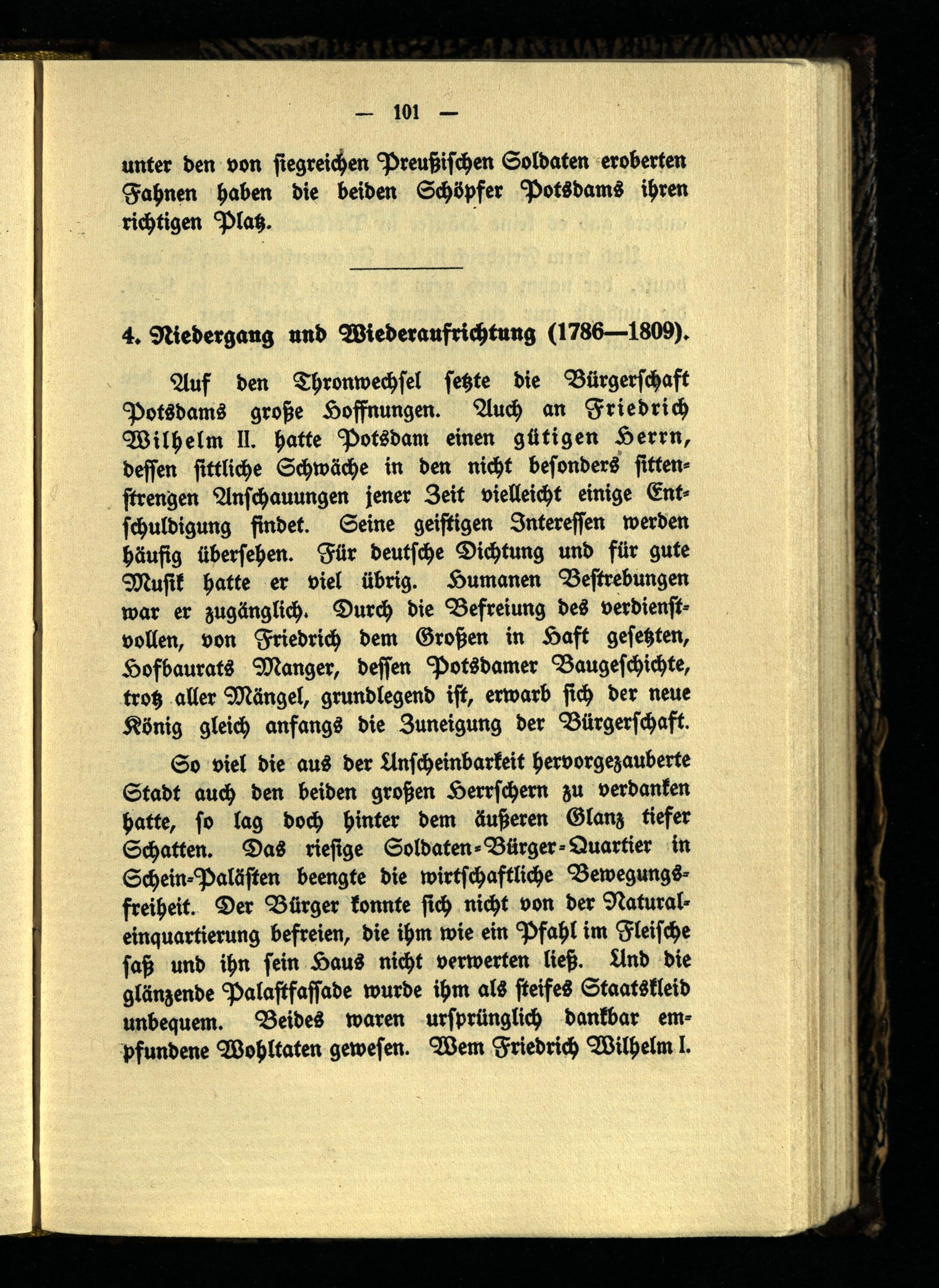 Auf den Thronwechsel setzte die Bürgerschaft Potsdams große Hoffnungen. Auch an Friedrich Wilhelm II. hatte Potsdam einen gütigen Herrn, dessen sittliche Schwäche in den nicht besonders sittenstrengen Anschauungen jener Zeit vielleicht einige Entschuldigung findet. Seine geistigen Interessen werden häufig übersehen. Für deutsche Dichtung und für gute Musik hatte er viel übrig. Lumanen Bestrebungen war er zugänglich. Durch die Befreiung des verdienstvollen, von Friedrich dem Großen in Last gesetzten, Lofbaurats Manger, dessen Potsdamer Baugeschichte, trotz aller Mängel, grundlegend ist, erwarb sich der neue König gleich anfangs die Zuneigung der Bürgerschaft.