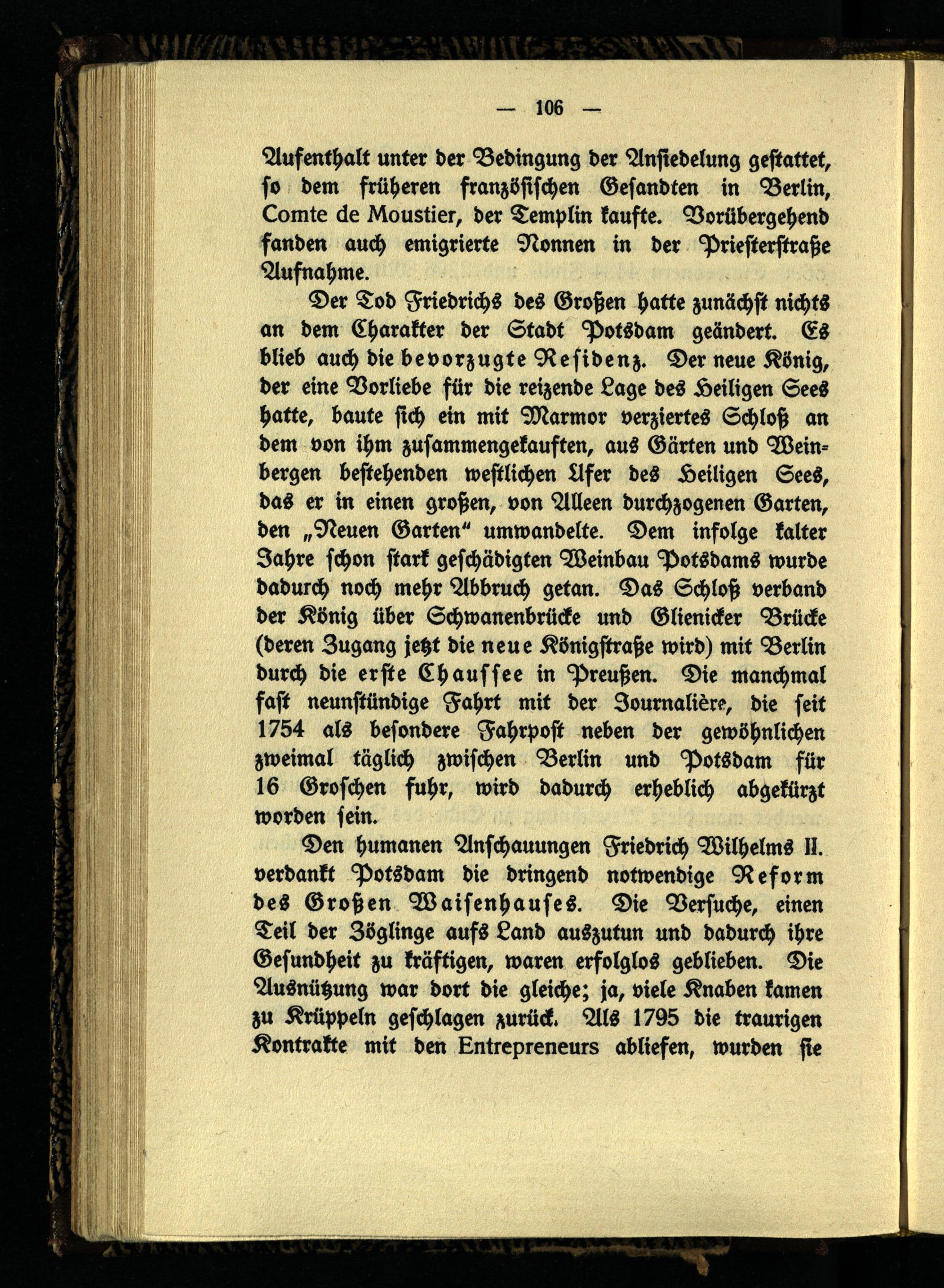 Der Tod Friedrichs des Großen hatte zunächst nichts an dem Charakter der Stadt Potsdam geändert. Es blieb auch die bevorzugte Residenz. Der neue König, der eine Vorliebe für die reizende Lage des Heiligen Sees hatte, baute sich ein mit Marmor verziertes Schloß an dem von ihm zusammengekauften, aus Gärten und Weinbergen bestehenden westlichen Ufer des Heiligen Sees, das er in einen großen, von Alleen durchzogenen Garten, den „Neuen Garten" umwandelte. Dem infolge kalter Jahre schon stark geschädigten Weinbau Potsdams wurde dadurch noch mehr Abbruch getan. Das Schloß verband der König über Schwanenbrücke und Glienicker Brücke (deren Zugang jetzt die neue Königstraße wird) mit Berlin durch die erste Chaussee in Preußen. Die manchmal fast neunstündige Fahrt mit der Journaliere, die seit 1754 als besondere Fahrpost neben der gewöhnlichen zweimal täglich zwischen Berlin und Potsdam für 16 Groschen fuhr, wird dadurch erheblich abgekürzt worden sein.