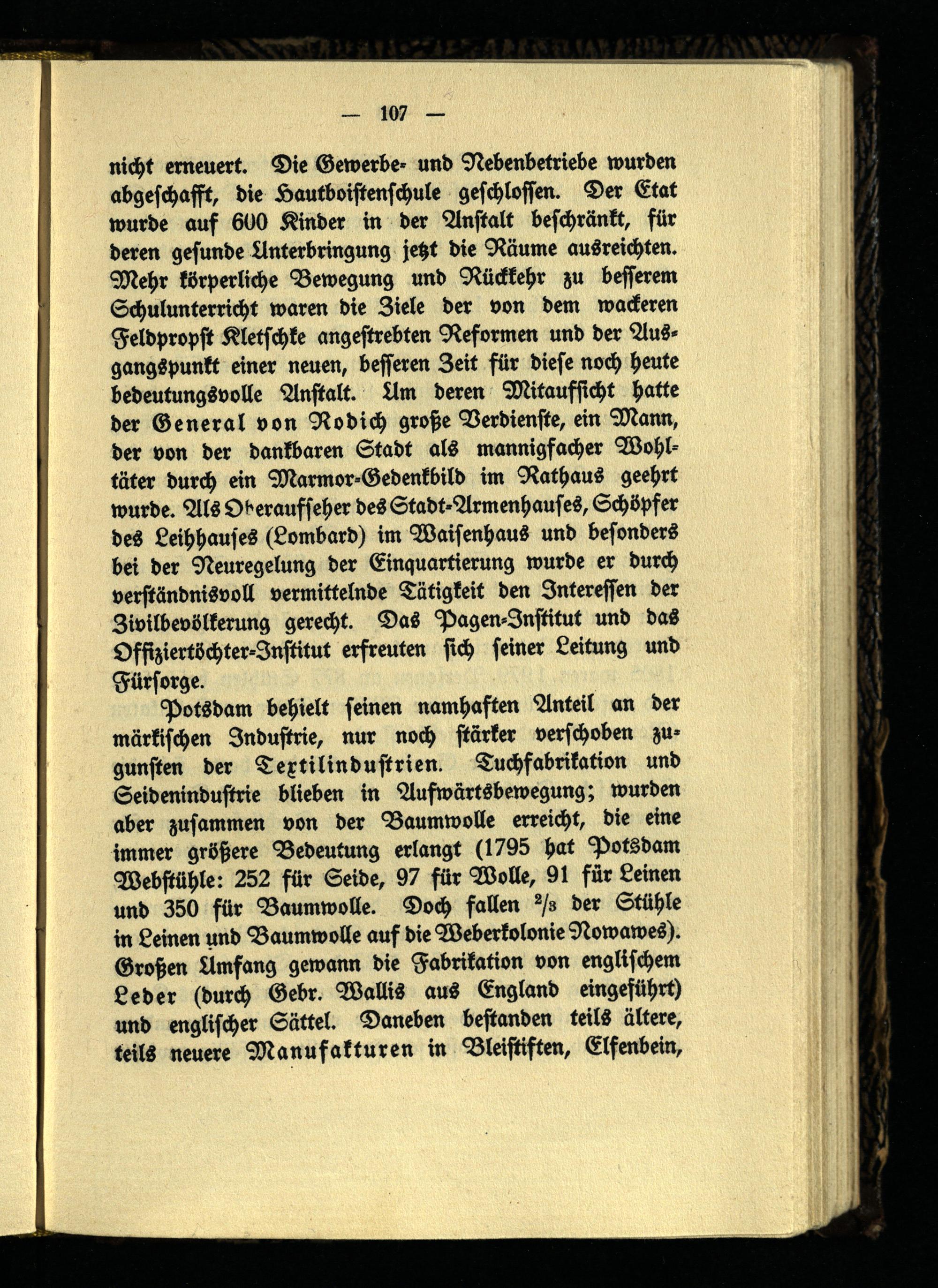 nicht erneuert. Die Gewerbe- und Nebenbetriebe wurden abgeschafft, die Lautboistenschule geschloffen. Der Etat wurde auf 600 Kinder in der Anstalt beschränkt, für deren gesunde Unterbringung jetzt die Räume ausreichten. Mehr körperliche Bewegung und Rückkehr zu besserem Schulunterricht waren die Ziele der von dem wackeren Feldpropst Kletschke angestrebten Reformen und der Ausgangspunkt einer neuen, besseren Zeit für diese noch heute bedeutungsvolle Anstalt. Am deren Mitaufsicht hatte der General von Rodich große Verdienste, ein Mann, der von der dankbaren Stadt als mannigfacher Wohltäter durch ein Marmor-Gedenkbild im Rathaus geehrt wurde. Als Oberaufseher des Stadt-Armenhauses, Schöpfer des Leihhauses (Lombard) im Waisenhaus und besonders bei der Neuregelung der Einquartierung wurde er durch verständnisvoll vermittelnde Tätigkeit den Interessen der Zivilbevölkerung gerecht. Das Pagen-Institut und das Offiziertöchter-Institut erfreuten sich seiner Leitung und Fürsorge.