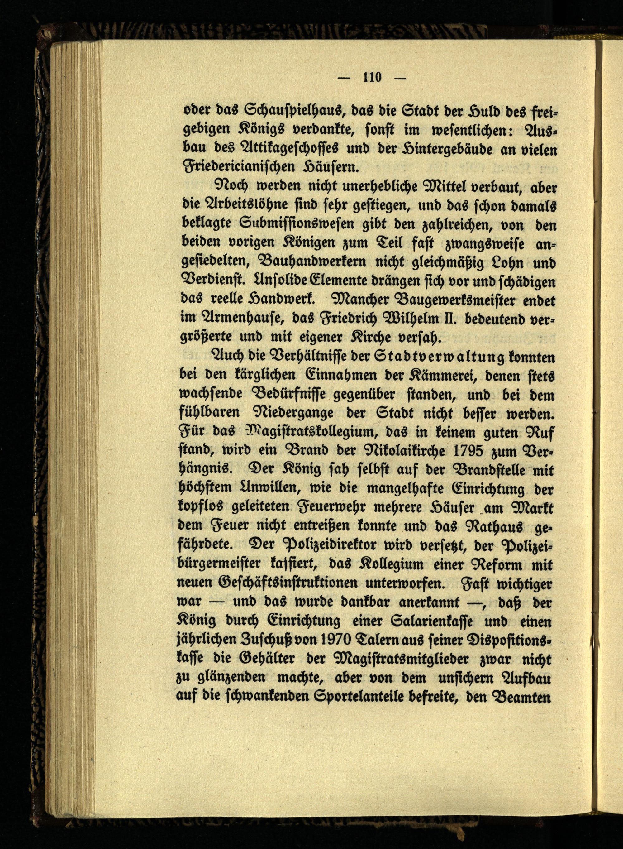 Auch die Verhältnisse der n Stadtverwaltung konnte bei den kärglichen Einnahmen der Kämmerei, denen stets wachsende Bedürfnisse gegenüber standen, und bei dem fühlbaren Niedergange der Stadt nicht besser werden. Für das Magistratskollegium, das in keinem guten Ruf stand, wird ein Brand der Nikolaikirche 1795 zum Verhängnis. Der König sah selbst auf der Brandstelle mit höchstem Unwillen, wie die mangelhafte Einrichtung der kopflos geleiteten Feuerwehr mehrere Häuser am Markt dem Feuer nicht entreißen konnte und das Rathaus gefährdete. Der Polizeidirektor wird versetzt, der Polizeibürgermeister kassiert, das Kollegium einer Reform mit neuen Geschäftsinstruktionen unterworfen. Fast wichtiger war — und das wurde dankbar anerkannt —, daß der König durch Einrichtung einer Salarienkasse und einen jährlichen Zuschuß von 1970 Talern aus seiner Dispofitions- kasse die Gehälter der Magistratsmitglieder zwar nicht zu glänzenden machte, aber von dem unsichern Aufbau auf die schwankenden Sportelanteile befreite, den Beamten