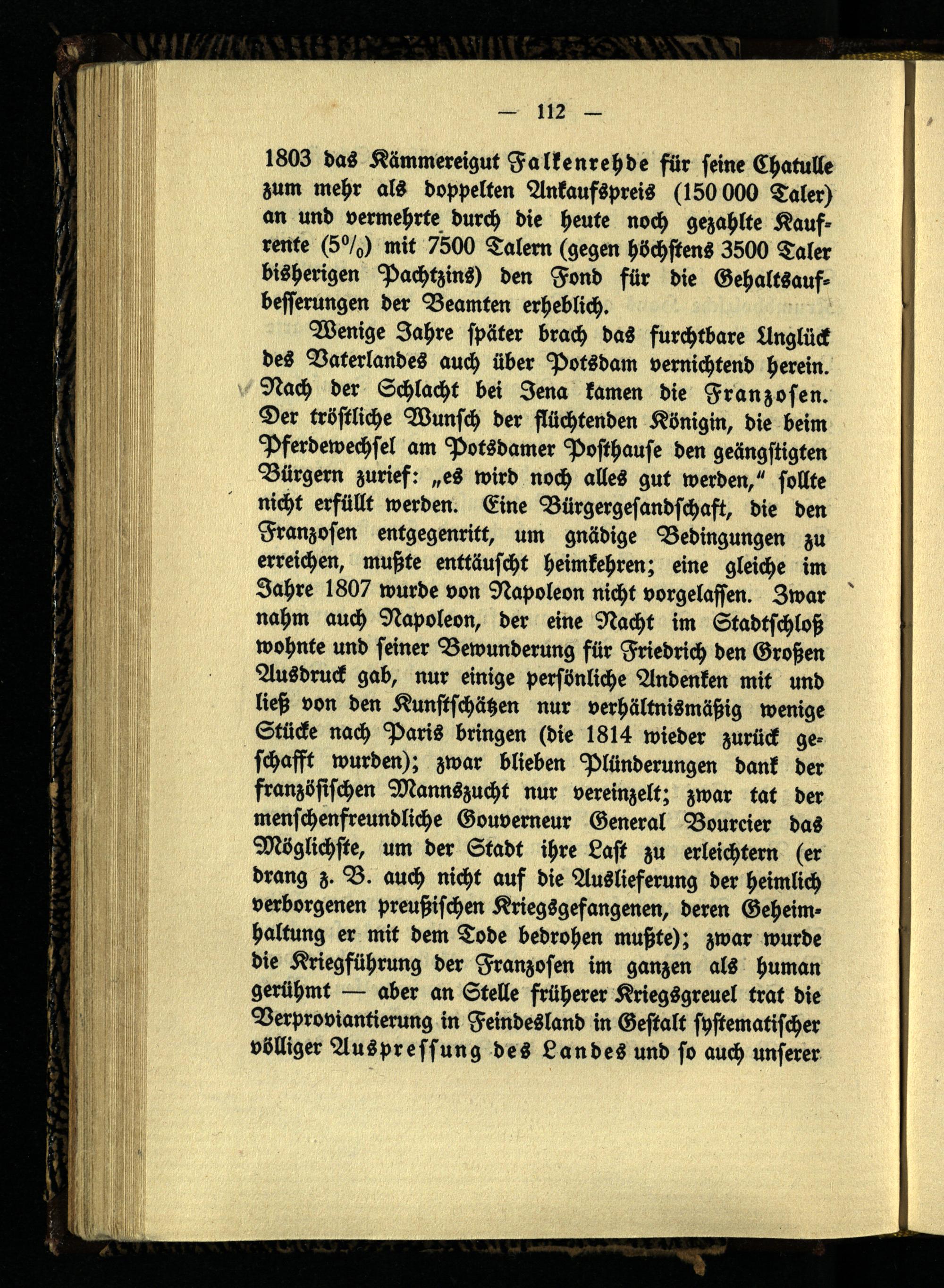 Nach der Schlacht bei Jena kamen die Franzosen. Der tröstliche Wunsch der flüchtenden Königin, die beim Pferdewechsel am Potsdamer Posthause den geängstigten Bürgern zurief: „es wird noch alles gut werden," sollte nicht erfüllt werden. Eine Bürgergesandschaft, die den Franzosen entgegenritt, um gnädige Bedingungen zu erreichen, mußte enttäuscht heimkehren; eine gleiche im Jahre 1807 wurde von Napoleon nicht vorgelassen. Zwar nahm auch Napoleon, der eine Nacht im Stadtschloß wohnte und seiner Bewunderung für Friedrich den Großen Ausdruck gab, nur einige persönliche Andenken mit und ließ von den Kunstschätzen nur verhältnismäßig wenige Stücke nach Paris bringen (die 1814 wieder zurück geschafft wurden); zwar blieben Plünderungen dank der französischen Mannszucht nur vereinzelt; zwar tat der menschenfreundliche Gouverneur General Bourcier das Möglichste, um der Stadt ihre Last zu erleichtern (er drang z. B. auch nicht auf die Auslieferung der heimlich verborgenen preußischen Kriegsgefangenen, deren Geheimhaltung er mit dem Tode bedrohen mußte); zwar wurde die Kriegführung der Franzosen im ganzen als human gerühmt — aber an Stelle früherer Kriegsgreuel trat die Verproviantierung in Feindesland in Gestalt systematischer völliger Auspressung des Landes und so auch unserer