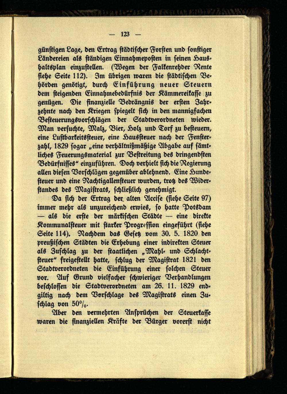 Da sich der Ertrag der. altm Accise (siehe Seite 97) immer mehr als unzureichend erwies, so hatte Potsdam — als die erste der märkischen Städte — eine direkte Kommunalsteuer mit starker Progression eingeführt (siehe Seite 114). Nachdem das Gesetz vom 30. 5. 1820 den preußischen Städtm die Erhebung einer indirekten Steuer als Zuschlag zu der staatlichen „Mahl- und Schlachtsteuer" freigestellt hatte, schlug der Magistrat 1821 den Stadtverordneten die Einführung einer solchen Steuer vor. Auf Grund vielfacher schwieriger Verhandlungen beschlossen die Stadtverordnetm am 26. 11. 1829 end- giltig nach dem Vorschläge des Magistrats einen Zuschlag von 50 %.