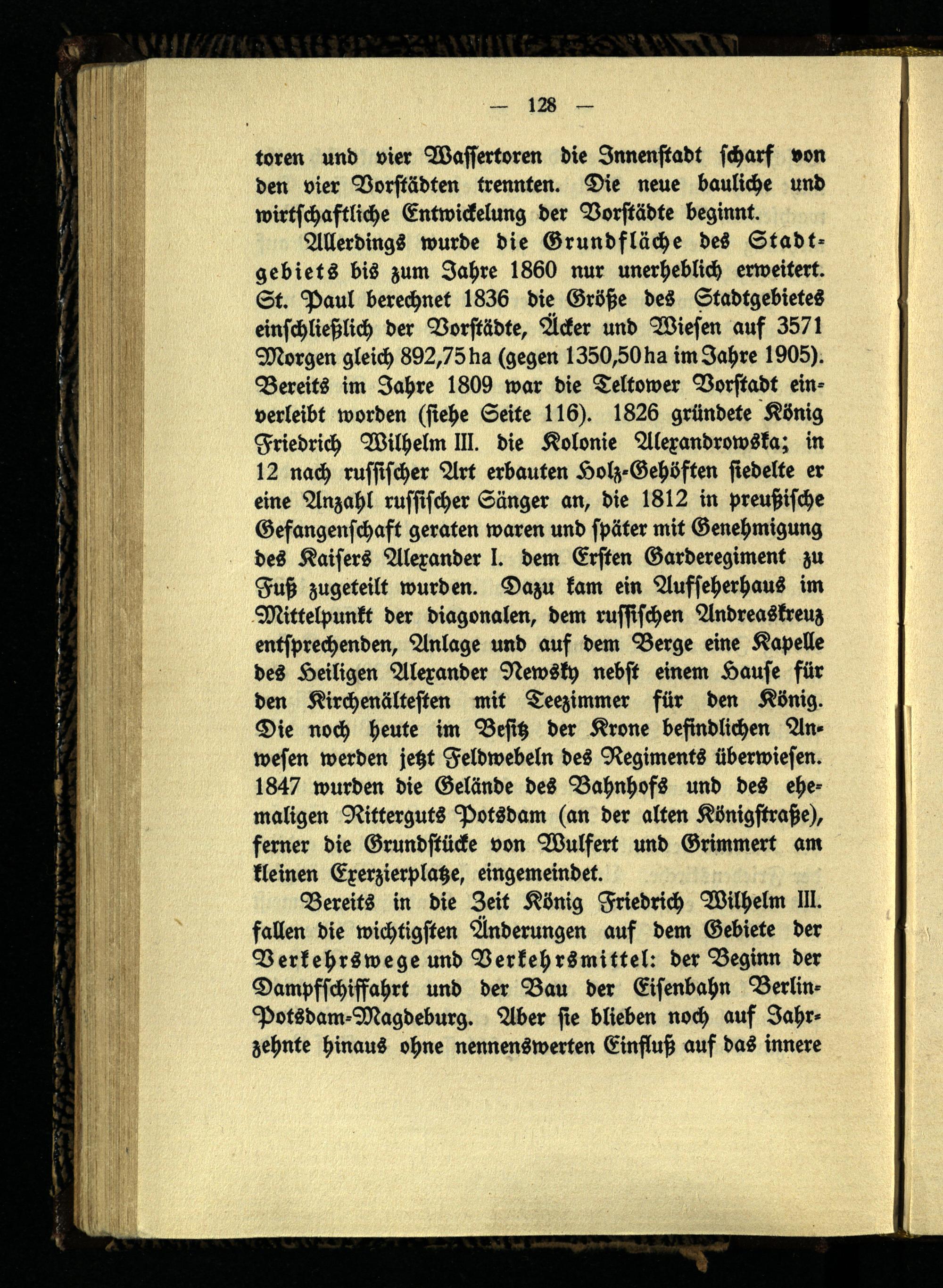 Allerdings wurde die Grundfläche des Stadtgebiets bis zum Jahre 1860 nur unerheblich erweitert. St. Paul berechnet 1836 die Größe des Stadtgebietes einschließlich der Vorstädte, Äcker und Wiesen auf 3571 Morgen gleich 892,75 ha (gegen 1350,50 ha im Jahre 1905). Bereits im Jahre 1809 war die Teltower Vorstadt einverleibt worden (siehe Seite 116). 1826 gründete König Friedrich Wilhelm III. die Kolonie Alexandrowska; in 12 nach russischer Art erbauten Holz-Gehöften siedelte er eine Anzahl russischer Sänger an, die 1812 in preußische Gefangenschaft geraten waren und später mit Genehmigung des Kaisers Alexander I. dem Ersten Garderegiment zu Fuß zugeteilt wurden. Dazu kam ein Aufseherhaus im Mittelpunkt der diagonalen, dem russischen Andreaskreuz entsprechenden, Anlage und auf dem Berge eine Kapelle des Heiligen Alexander Newsky nebst einem Hause für den Kirchenältesten mit Teezimmer für den König. Die noch heute im Besitz der Krone befindlichen Anwesen werden jetzt Feldwebeln des Regiments überwiesen. 1847 wurden die Gelände des Bahnhofs und des ehemaligen Ritterguts Potsdam (an der alten Königstraße), ferner die Grundstücke von Wulfert und Grimmert am kleinen Exerzierplatze, eingemeindet.