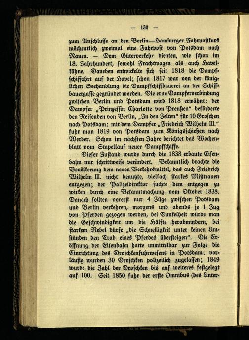 Dieser Zustand wurde durch die 1838 erbaute Eisenbahn nur schrittweise verändert. Bekanntlich brachte die Bevölkerung dem neuen Verkehrsmittel, das auch Friedrich Wilhelm III. nicht benutzte, vielfach starkes Mißtrauen entgegen; der Polizeidirektor suchte dem entgegen zu wirken durch eine Bekanntmachung vom Oktober 1838. Danach sollten vorerst nur 4 Züge zwischen Potsdam und Berlin verkehren, morgens und abends je 1 Zug von Pferden gezogen werden, bei Dunkelheit würde man die Geschwindigkeit um die Hälfte herabmindern, bei starkem Nebel dürfe „die Schnelligkeit unter keinen Umständen den Trab eines Pferdes übersteigen". Die Eröffnung der Eisenbahn hatte unmittelbar zur Folge die Einrichtung des Droschkenfuhrwesens in Potsdam; vorläufig wurden 30 Droschken polizeilich zugelassen; 1849 wurde die Zahl der Droschken bis auf weiteres festgelegt auf 100. Seit 1850 fuhr der erste Omnibus (des Unter-