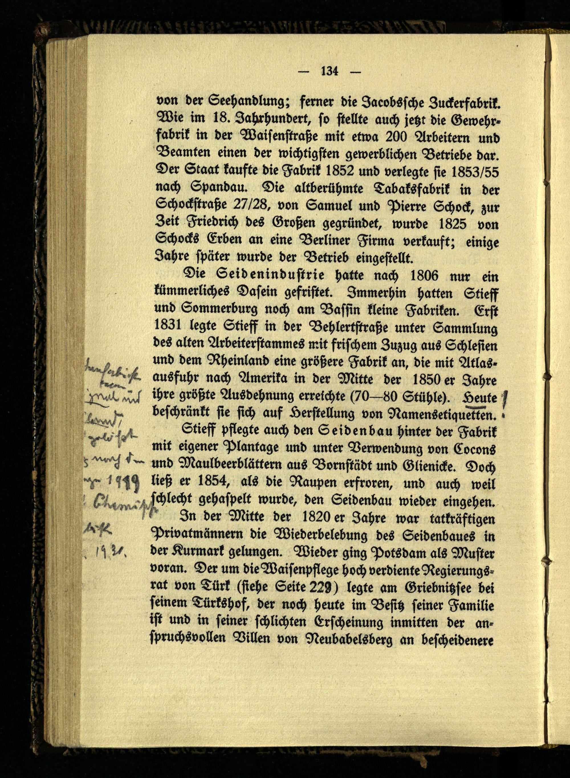 von der Seehandlung; ferner die Iacobssche Zuckerfabrik. Wie im 18. Jahrhundert, so stellte auch jetzt die Gewehr- fabrik in der Waisenstraße mit etwa 200 Arbeitern und Beamten einen der wichtigsten gewerblichen Betriebe dar. Der Staat kaufte die Fabrik 1852 und verlegte sie 1853/55 nach Spandau. Die altberühmte Tabaksfabrik in der Schockstraße 27/28, von Samuel und Pierre Schock, zur Zeit Friedrich des Großen gegründet, wurde 1825 von Schocks Erben an eine Berliner Firma verkauft; einige Jahre später wurde der Betrieb eingestellt.
