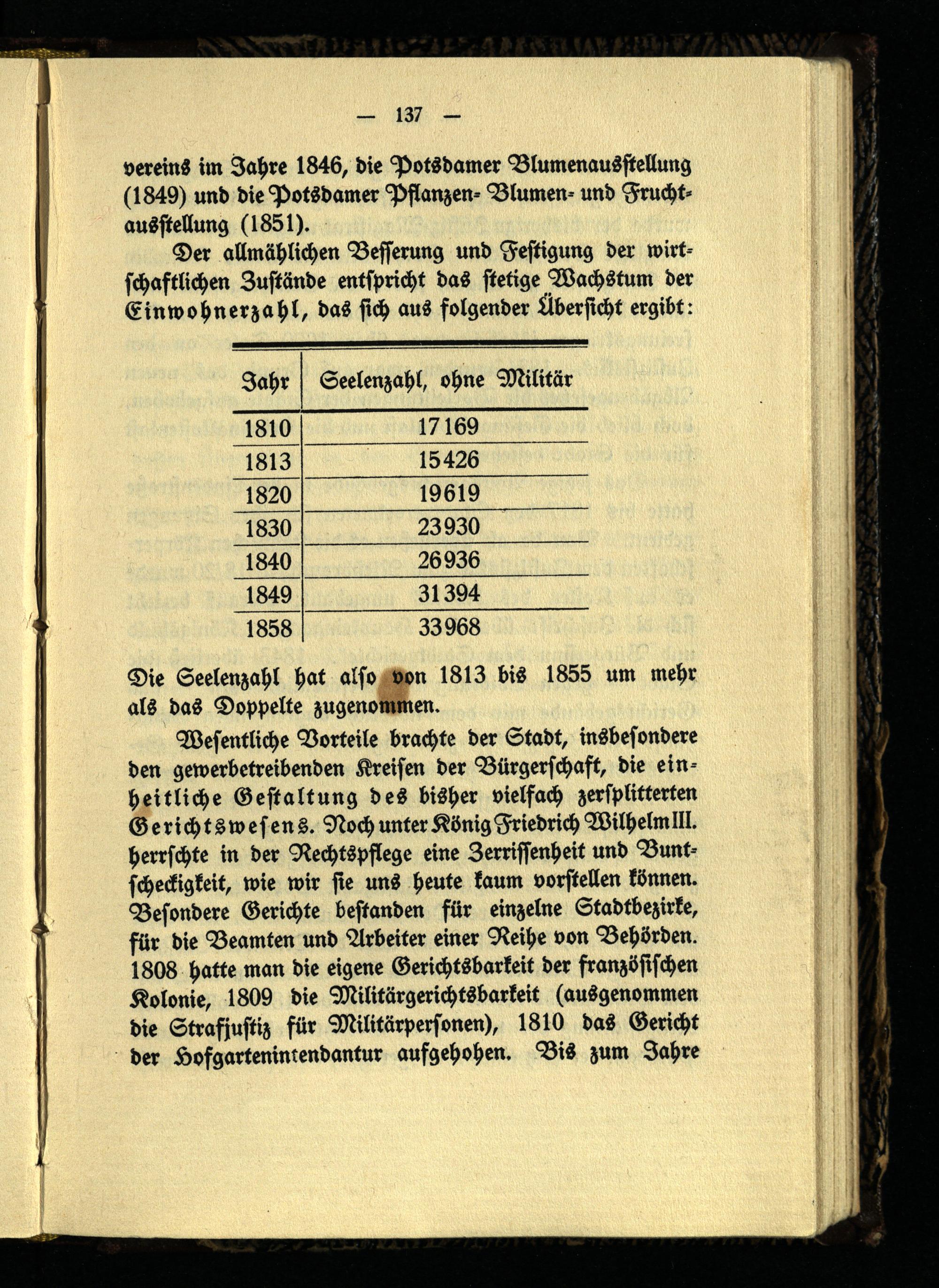 Wesentliche Vorteile brachte der Stadt, insbesondere den gewerbetreibenden Kreisen der Bürgerschaft, die einheitliche Gestaltung des bisher vielfach zersplitterten Gerichtswesens. Noch unter König Friedrich Wilhelm III. herrschte in der Rechtspflege eine Zerrissenheit und Bunt- scheckigkeit, wie wir sie uns heute kaum vorstellen können. Besondere Gerichte bestanden für einzelne Stadtbezirke, für die Beamten und Arbeiter einer Reihe von Behörden. 1808 hatte man die eigene Gerichtsbarkeit der französischen Kolonie, 1809 die Militärgerichtsbarkeit (ausgenommen die Strafjustiz für Militärpersonen), 1810 das Gericht der Hofgartenintendantur aufgehohen. Bis zum Jahre