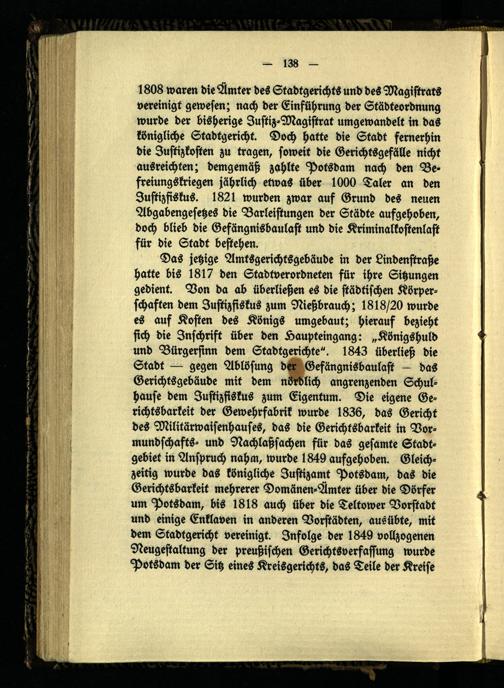 Das jetzige Amtsgerichtsgebäude in der Lindenstraße hatte bis 1817 den Stadtverordneten für ihre Sitzungen gedient. Von da ab überließen es die städtischen Körperschaften dem Justizfiskus zum Nießbrauch; 1818/20 wurde es auf Kosten des Königs umgebaut; hierauf bezieht sich die Inschrift über den Laupteingang: „Königshuld und Bürgersinn dem Stadtgerichte". 1843 überließ die Stadt — gegen Ablösung der Gefängnisbaulast — das Gerichtsgebäude mit dem nördlich angrenzenden Schulhause dem Justizfiskus zum Eigentum. Die eigene Gerichtsbarkeit der Gewehrfabrik wurde 1836, das Gericht des Militärwaisenhauses, das die Gerichtsbarkeit in Vormundschafts- und Nachlaßsachen für das gesamte Stadtgebiet in Anspruch nahm, wurde 1849 aufgehoben. Gleichzeitig wurde das königliche Justizamt Potsdam, das die Gerichtsbarkeit mehrerer Domänen-Ämter über die Dörfer um Potsdam, bis 1818 auch über die Teltower Vorstadt und einige Enklaven in anderen Vorstädten, ausübte, mit dem Stadtgericht vereinigt. Infolge der 1849 vollzogenen Neugestaltung der preußischen Gerichtsverfassung wurde Potsdam der Sitz eines Kreisgerichts, das Teile der Kreise
