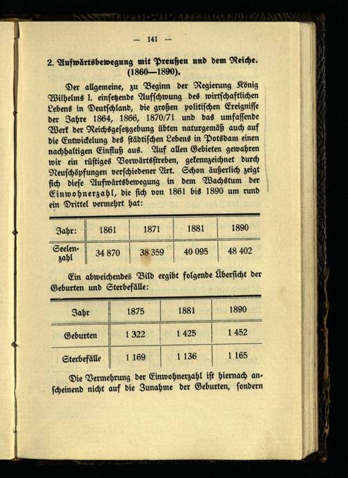 Der allgemeine, zu Beginn der Regierung König Wilhelms I. einsetzende Aufschwung des wirtschaftlichen Lebens in Deutschland, die großen politischen Ereignisse der Jahre 1864, 1866, 1870/71 und das umfassende Werk der Reichsgesetzgebung übten naturgemäß auch auf die Entwickelung des städtischen Lebens in Potsdam einen nachhaltigen Einfluß aus. Auf allen Gebieten gewahren wir ein rüstiges Vorwärtsstreben, gekennzeichnet durch Neuschöpfungen verschiedener Art. Schon äußerlich zeigt sich diese Aufwärtsbewegung in dem Wachstum der Einwohnerzahl, die sich von 1861 bis 1890 um rund ein Drittel vermehrt hat: