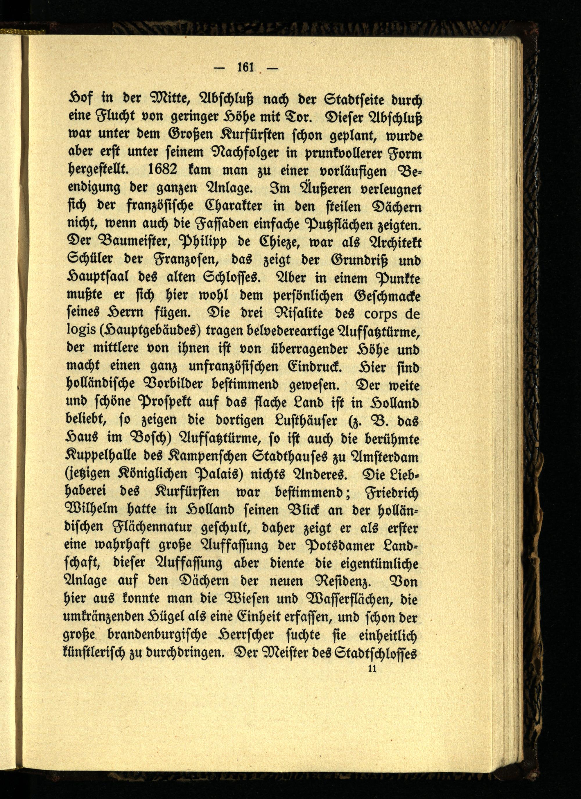 Hos in der Mitte, Abschluß nach der Stadtseite durch eine Flucht von geringer Höhe mit Tor. Dieser Abschluß war unter dem Großen Kurfürsten schon geplant, wurde aber erst unter seinem Nachfolger in prunkvollerer Form hergestellt. 1682 kam man zu einer vorläufigen Beendigung der ganzen Anlage. Im Äußeren verleugnet sich der französische Charakter in den steilen Dächern nicht, wenn auch die Fassaden einfache Putzflächen zeigten. Der Baumeister, Philipp de Chieze, war als Architekt Schüler der Franzosen, das zeigt der Grundriß und Lauptsaal des alten Schlosses. Aber in einem Punkte mußte er sich hier wohl dem persönlichen Geschmacks seines Herrn fügen. Die drei Risalite des corps de logis (Hauptgebäudes) tragen belvedereartige Aufsatztürme, der mittlere von ihnen ist von überragender Höhe und macht einen ganz unfranzösischen Eindruck. Hier sind holländische Vorbilder bestimmend gewesen. Der weite und schöne Prospekt auf das flache Land ist in Holland beliebt, so zeigen die dortigen Lusthäuser (z. B. das Laus im Bosch) Aufsatztürme, so ist auch die berühmte Kuppelhalle des Kampenschen Stadthauses zu Amsterdam (jetzigen Königlichen Palais) nichts Anderes. Die Liebhaberei des Kurfürsten war bestimmend; Friedrich Wilhelm hatte in Holland seinen Blick an der holländischen Flächennatur geschult, daher zeigt er als erster eine wahrhaft große Auffassung der Potsdamer Landschaft, dieser Auffassung aber diente die eigentümliche Anlage auf den Dächern der neuen Residenz. Von hier aus konnte man die Wiesen und Wasserflächen, die umkränzenden Hügel als eine Einheit erfassen, und schon der große brandenburgische Herrscher suchte sie einheitlich