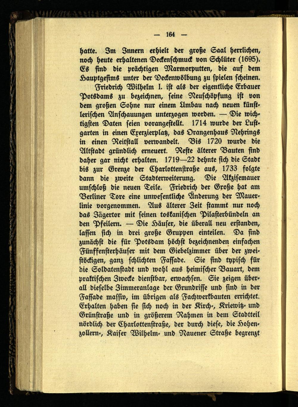 Friedrich Wilhelm I. ist als der eigentliche Erbauer Potsdams zu bezeichnen, seine Neuschöpfung ist von dem großen Sohne nur einem Ambau nach neuen künstlerischen Anschauungen unterzogen worden. — Die wichtigsten Daten seien vorangestellt. 1714 wurde der Lustgarten in einen Exerzierplatz, das Orangenhaus Nehrings in einen Reitstall verwandelt. Bis 1720 wurde die Altstadt gründlich erneuert. Reste älterer Bauten sind daher gar nicht erhalten. 1719—22 dehnte sich die Stadt bis zur Grenze der Charlottenstraße aus, 1733 folgte dann die zweite Stadterweiterung. Die Akzisemauer umschloß die neuen Teile. Friedrich der Große hat am Berliner Tore eine unwesentliche Änderung der Mauerlinie vorgenommen. Aus älterer Zeit stammt nur noch das Jägertor mit seinen toskanischen Pilasterbündeln an den Pfeilern. — Die Häuser, die überall neu erstanden, lassen sich in drei große Gruppen einteilen. Da sind zunächst die für Potsdam höchst bezeichnenden einfachen Fünffensterhäuser mit dem Giebelzimmer über der zweistöckigen, ganz schlichten Fassade. Sie sind typisch für die Soldatenstadt und wohl aus heimischer Bauart, dem praktischen Zwecke dienstbar, erwachsen. Sie zeigen überall dieselbe Zimmeranlage der Grundrisse und sind in der Fassade massiv, im übrigen als Fachwerkbauten errichtet. Erhalten haben sie sich noch in der Kirch-, Kriewitz- und Grünstraße und in größerem Rahmen in dem Stadtteil nördlich der Charlottenstraße, der durch diese, die Hohenzollern-, Kaiser Wilhelm- und Nauener Straße begrenzt
