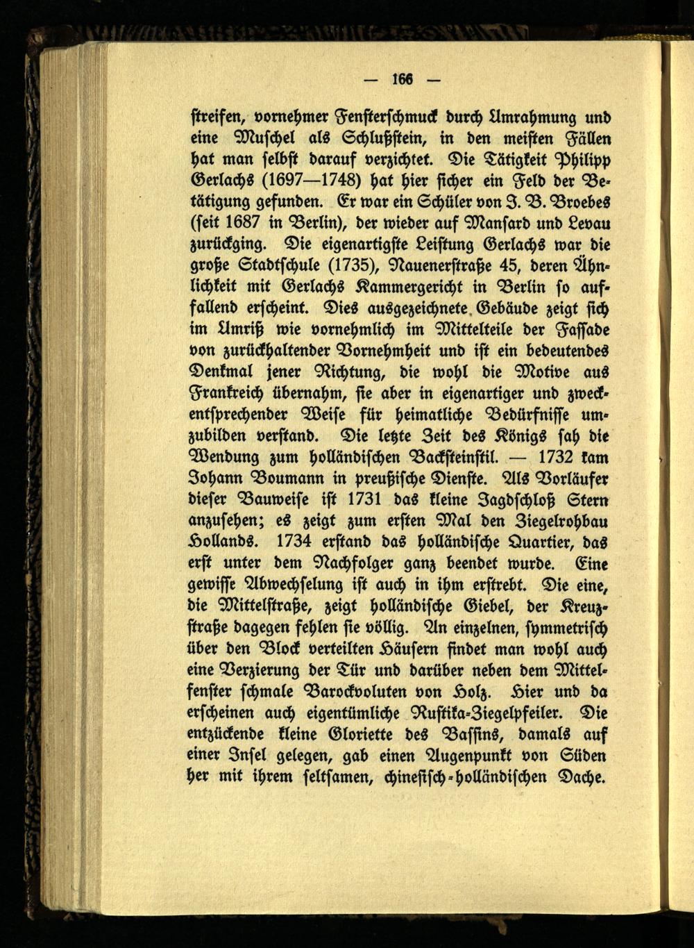 streifen, vornehmer Fensterschmuck durch Umrahmung und eine Muschel als Schlußstein, in den meisten Fällen hat man selbst darauf verzichtet. Die Tätigkeit Philipp Gerlachs (1697—1748) hat hier sicher ein Feld der Betätigung gefunden. Er war ein Schüler von J. B. Broebes (seit 1687 in Berlin), der wieder auf Mansard und Levau zurückging. Die eigenartigste Leistung Gerlachs war die große Stadtschule (1735), Nauenerstraße 45, deren Ähnlichkeit mit Gerlachs Kammergericht in Berlin so auffallend erscheint. Dies ausgezeichnete Gebäude zeigt sich im Umriß wie vornehmlich im Mittelteile der Fassade von zurückhaltender Vornehmheit und ist ein bedeutendes Denkmal jener Richtung, die wohl die Motive aus Frankreich übernahm, sie aber in eigenartiger und zweckentsprechender Weise für heimatliche Bedürfnisse umzubilden verstand. Die letzte Zeit des Königs sah die Wendung zum holländischen Backsteinstil. — 1732 kam Johann Boumann in preußische Dienste. Als Vorläufer dieser Bauweise ist 1731 das kleine Jagdschloß Stern anzusehen; es zeigt zum ersten Mal den Ziegelrohbau Hollands. 1734 erstand das holländische Quartier, das erst unter dem Nachfolger ganz beendet wurde. Eine gewisse Abwechselung ist auch in ihm erstrebt. Die eine, die Mittelstraße, zeigt holländische Giebel, der Kreuzstraße dagegen fehlen sie völlig. An einzelnen, symmetrisch über den Block verteilten Häusern findet man wohl auch eine Verzierung der Tür und darüber neben dem Mittelfenster schmale Barockvoluten von Holz. Hier und da erscheinen auch eigentümliche Rustika-Ziegelpfeiler. Die entzückende kleine Gloriette des Bassins, damals auf einer Insel gelegen, gab einen Augenpunkt von Süden her mit ihrem seltsamen, chinesisch-holländischen Dache.
