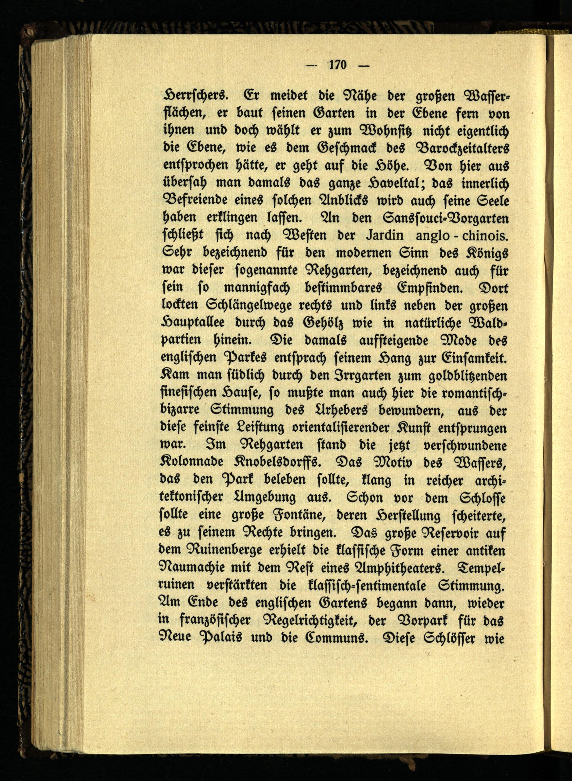 Herrschers. Er meidet die Nähe der großen Wasserflächen, er baut seinen Garten in der Ebene fern von ihnen und doch wählt er zum Wohnsitz nicht eigentlich die Ebene, wie es dem Geschmack des Barockzeitalters entsprochen hätte, er geht auf die Höhe. Von hier aus übersah man damals das ganze Haveltal; das innerlich Befreiende eines solchen Anblicks wird auch seine Seele haben erklingen lassen. An den Sanssouci-Vorgarten schließt sich nach Westen der Cardin sn^lo - ctiinois. Sehr bezeichnend für den modernen Sinn des Königs war dieser sogenannte Rehgarten, bezeichnend auch für sein so mannigfach bestimmbares Empfinden. Dort lockten Schlängelwege rechts und links neben der großen Hauptallee durch das Gehölz wie in natürliche Waldpartien hinein. Die damals aufsteigende Mode des englischen Parkes entsprach seinem Hang zur Einsamkeit. Kam man südlich durch den Irrgarten zum goldblitzenden sinesischen Hause, so mußte man auch hier die romantischbizarre Stimmung des Urhebers bewundern, aus der diese feinste Leistung orientalisierender Kunst entsprungen war. Im Rehgarten stand die jetzt verschwundene Kolonnade Knobelsdorffs. Das Motto des Wassers, das den Park beleben sollte, klang in reicher architektonischer Umgebung aus. Schon vor dem Schlosse sollte eine große Fontäne, deren Herstellung scheiterte, es zu seinem Rechte bringen. Das große Reservoir auf dem Ruinenberge erhielt die klassische Form einer antiken Naumachie mit dem Rest eines Amphitheaters. Tempelruinen verstärkten die klassisch-sentimentale Stimmung. Am Ende des englischen Gartens begann dann, wieder in französischer Regelrichttgkeit, der Vorpark für das Neue Palais und die Communs. Diese Schlösser wie