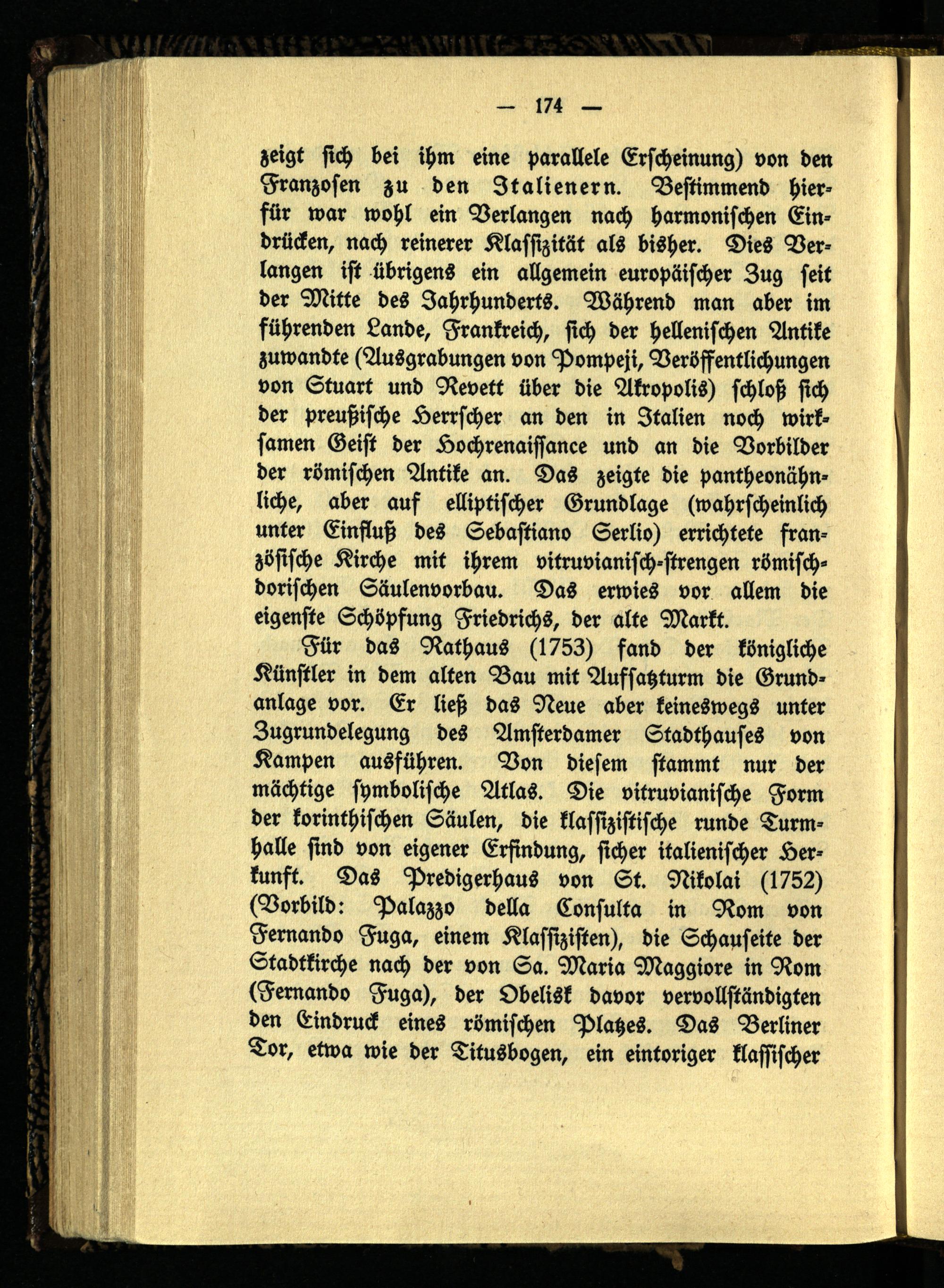 zeigt sich bei ihm eine parallele Erscheinung) von den Franzosen zu den Italienern. Bestimmend hierfür war wohl ein Verlangen nach harmonischen Eindrücken, nach reinerer Klassizität als bisher. Dies Verlangen ist übrigens ein allgemein europäischer Zug seit der Mitte des Jahrhunderts. Während man aber im führenden Lande, Frankreich, sich der hellenischen Antike zuwandte (Ausgrabungen von Pompeji, Veröffentlichungen von Stuart und Revett über die Akropolis) schloß sich der preußische Herrscher an den in Italien noch wirksamen Geist der Hochrenaissance und an die Vorbilder der römischen Antike an. Das zeigte die pantheonähnliche, aber auf elliptischer Grundlage (wahrscheinlich unter Einfluß des Sebastians Serlio) errichtete französische Kirche mit ihrem vitruvianisch-strengen römischdorischen Säulenvorbau. Das erwies vor allem die eigenste Schöpfung Friedrichs, der alte Markt.