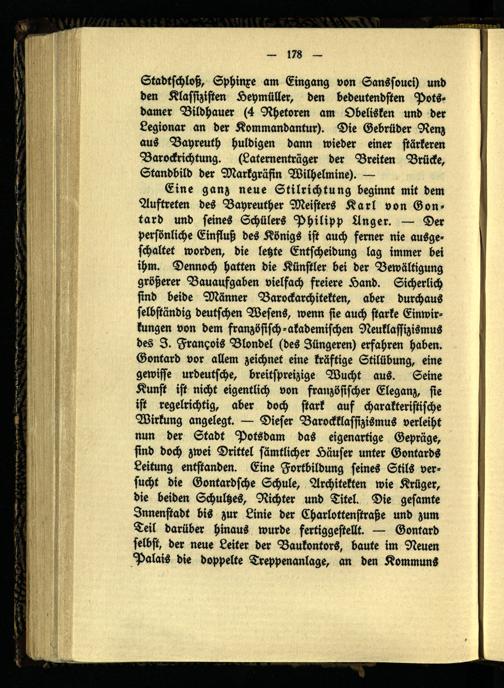 Eine ganz neue Stilrichtung beginnt mit dem Auftreten des Bayreuther Meisters Karl von Gon - tard und seines Schülers Philipp Unger. — Der persönliche Einfluß des Königs ist auch femer nie ausgeschaltet worden, die letzte Entscheidung lag immer bei ihm. Dennoch hatten die Künstler bei der Bewältigung größerer Bauaufgaben vielfach freiere Hand. Sicherlich sind beide Männer Barockarchitekten, aber durchaus selbständig deutschen Wesens, wenn sie auch starke Einwirkungen von dem französisch-akademischen Neuklassizismus des J. Francois Blonde! (des Jüngeren) erfahren haben. Gontard vor allem zeichnet eine kräftige Stilübung, eine gewisse urdeutsche, breitspreizige Wucht aus. Seine Kunst ist nicht eigentlich von französischer Eleganz, sie ist regelrichtig, aber doch stark auf charakteristische Wirkung angelegt. — Dieser Barockklassizismus verleiht nun der Stadt Potsdam das eigenartige Gepräge, sind doch zwei Drittel sämtlicher Häufer unter Gontards Leitung entstanden. Eine Fortbildung seines Stils versucht die Gontardsche Schule, Architekten wie Krüger, die beiden Schultzes, Richter und Titel. Die gesamte Innenstadt bis zur Linie der Charlottenstraße und zum Teil darüber hinaus wurde fertiggestellt. — Gontard selbst, der neue Leiter der Baukontors, baute im Neuen Palais die doppelte Treppenanlage, an den Kommuns