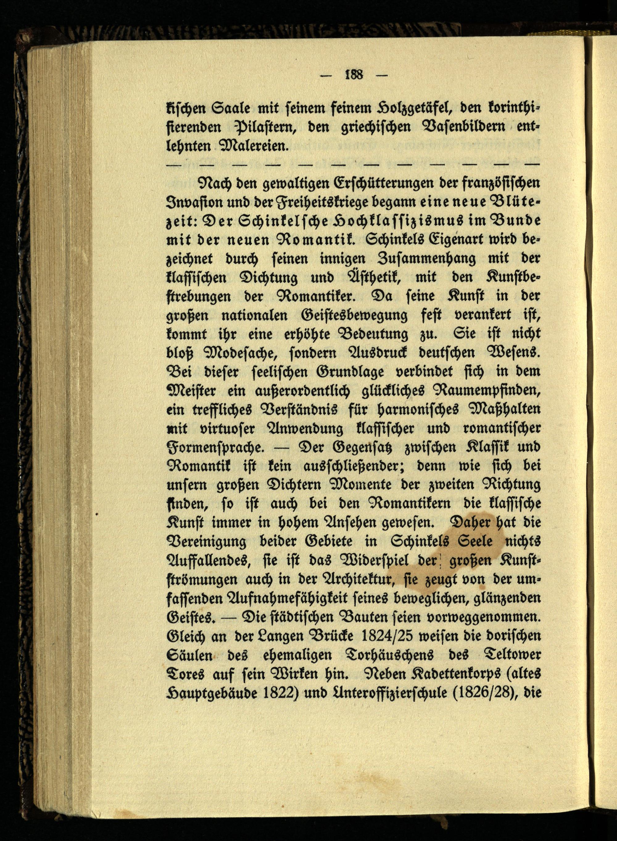 Nach den gewaltigen Erschütterungen der französischen Invasion und der Freiheitskriege begann eine neue Blütezeit: Der Schinkelsche Hochklassizismus im Bunde mit der neuen Romantik. Schinkels Eigenart wird bezeichnet durch seinen innigen Zusammenhang mit der klassischen Dichtung und Ästhetik, mit den Kunstbestrebungen der Romantiker. Da seine Kunst in der großen nationalen Geistesbewegung fest verankert ist, kommt ihr eine erhöhte Bedeutung zu. Sie ist nicht bloß Modesache, sondern Ausdruck deutschen Wesens. Bei dieser seelischen Grundlage verbindet sich in dem Meister ein außerordentlich glückliches Raumempfinden, ein treffliches Verständnis für harmonisches Maßhalten mit virtuoser Anwendung klassischer und romantischer Formensprache. — Der Gegensatz zwischen Klassik und Romantik ist kein ausschließender; denn wie sich bei unsern großen Dichtern Momente der zweiten Richtung finden, so ist auch bei den Romantikern die klassische Kunst immer in hohem Ansehen gewesen. Daher hat die Vereinigung beider Gebiete in Schinkels Seele nichts Auffallendes, sie ist das Widerspiel der großen Kunstströmungen auch in der Architektur, sie zeugt von der umfassenden Aufnahmefähigkeit seines beweglichen, glänzenden Geistes. — Die städtischen Bauten seien vorweggenommen. Gleich an der Langen Brücke 1824/25 weisen die dorischen Säulen des ehemaligen Torhäuschens des Teltower Tores auf sein Wirken hin. Neben Kadettenkorps (altes Hauptgebäude 1822) und Unteroffizierschule (1826/28), die