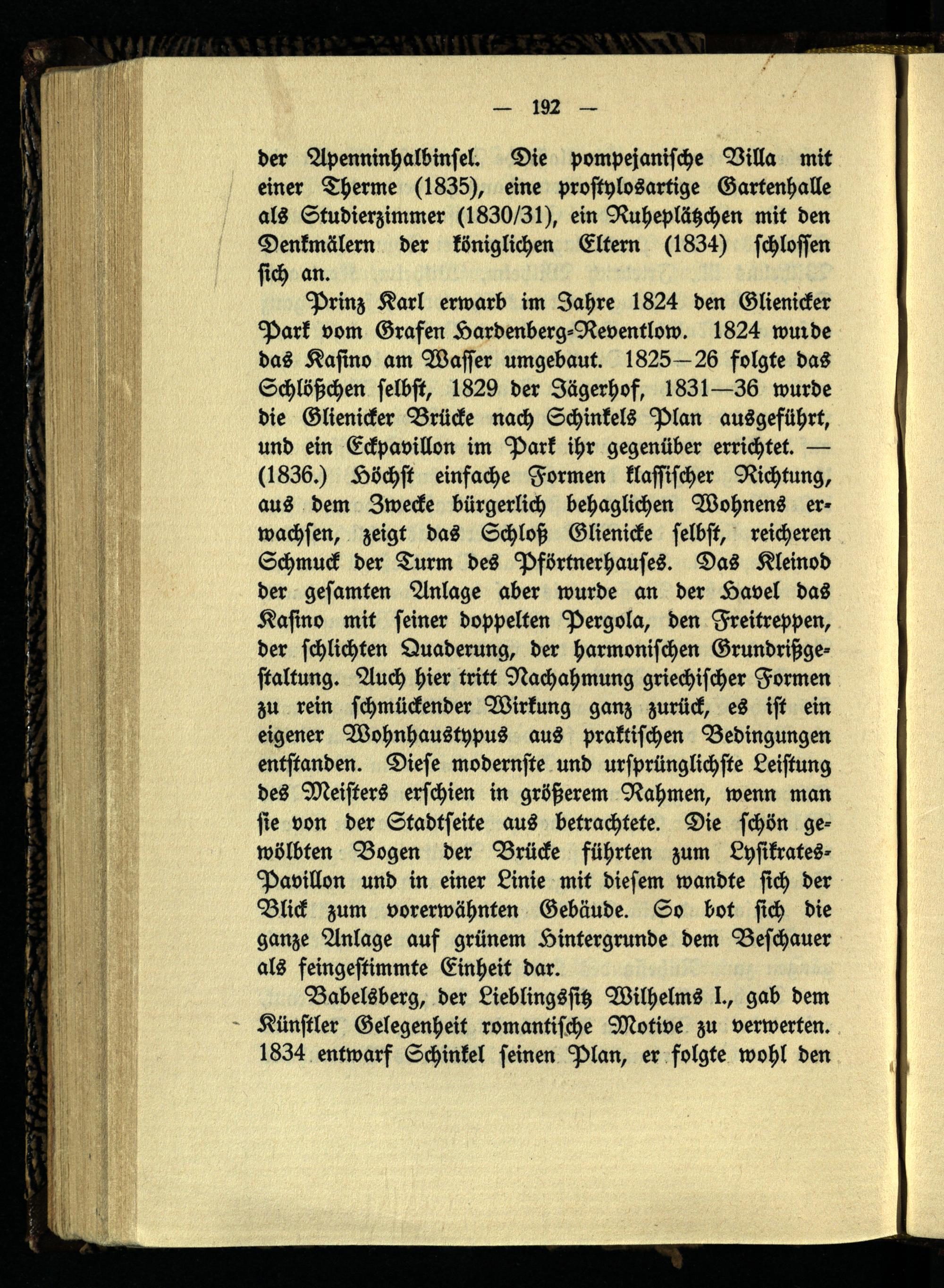 Prinz Karl erwarb im Jahre 1824 den Glienicker Park vom Grafen Hardenberg-Reventlow. 1824 wurde das Kasino am Wasser umgebaut. 1825—26 folgte das Schlößchen selbst, 1829 der Jägerhof, 1831—36 wurde die Glienicker Brücke nach Schinkels Plan ausgeführt, und ein Eckpavillon im Park ihr gegenüber errichtet. — (1836.) Höchst einfache Formen klassischer Richtung, aus dem Zwecke bürgerlich behaglichen Wohnens er- wachsen, zeigt das Schloß Glienicke selbst, reicheren Schmuck der Turm des Pförtnerhauses. Das Kleinod der gesamten Anlage aber wurde an der Havel das Kasino mit seiner doppelten Pergola, den Freitreppen, der schlichten Quaderung, der harmonischen Grundrißgestaltung. Auch hier tritt Nachahmung griechischer Formen zu rein schmückender Wirkung ganz zurück, es ist ein eigener Wohnhaustypus aus praktischen Bedingungen entstanden. Diese modernste und ursprünglichste Leistung des Meisters erschien in größerem Nahmen, wenn man sie von der Stadtseite aus betrachtete. Die schön gewölbten Bogen der Brücke führten zum Lysikrates- Pavillon und in einer Linie mit diesem wandte sich der Blick zum vorerwähnten Gebäude. So bot sich die ganze Anlage auf grünem Hintergründe dem Beschauer als feingestimmte Einheit dar.