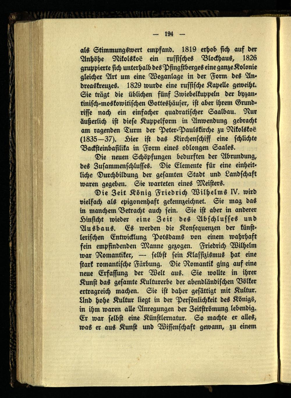 Die Zeit König Friedrich Wilhelms IV. wird vielfach als epigonenhaft gekennzeichnet. Sie mag das in manchem Betracht auch sein. Sie ist aber in anderer Hinsicht wieder eine Zeit des Abschlusses und Ausbaus. Es werden die Konsequenzen der künstlerischen Entwicklung Potsdams von einem wahrhaft fein empfindenden Manne gezogen. Friedrich Wilhelm war Romantiker, — selbst sein Klassizismus hat eine stark romantische Färbung. Die Romantik ging aus eine neue Erfassung der Welt aus. Sie wollte in ihrer Kunst das gesamte Kulturerbe der abendländischen Völker ertragreich machen. Sie ist daher gesättigt mit Kultur. Und hohe Kultur liegt in der Persönlichkeit des Königs, in ihm waren alle Anregungen der Zeitströmung lebendig. Er war selbst eine Künstlernatur. So machte er alles, was er aus Kunst und Wissenschaft gewann, zu einem