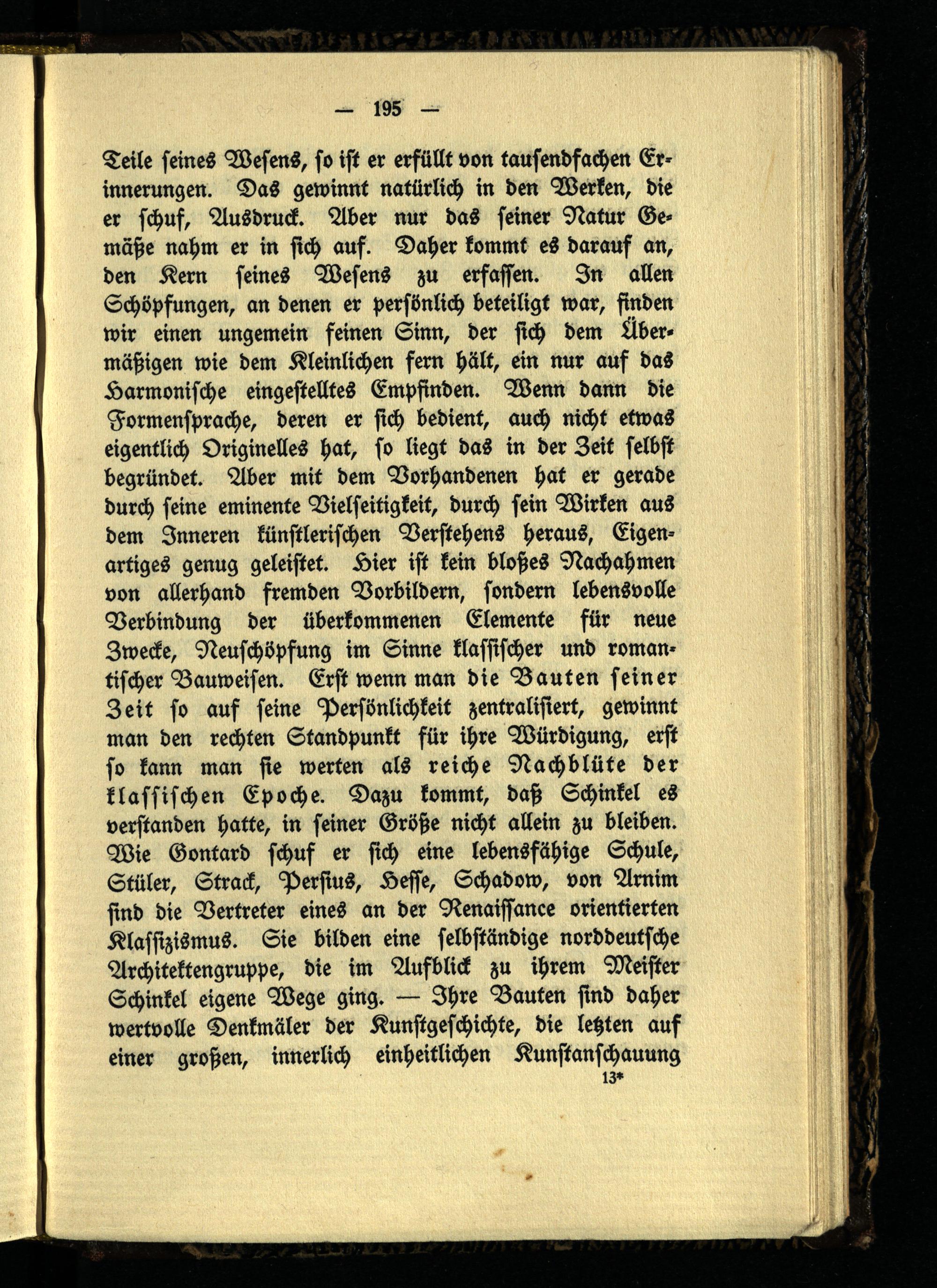 Teile seines Wesens, so ist er erfüllt von tausendfachen Er- innerungen. Das gewinnt natürlich in den Werken, die er schuf, Ausdruck. Aber nur das seiner Natur Gemäße nahm er in sich auf. Daher kommt es darauf an, den Kern seines Wesens zu erfassen. In allen Schöpfungen, an denen er persönlich beteiligt war, finden wir einm ungemein feinen Sinn, der sich dem Übermäßigen wie dem Kleinlichen fern hält, ein nur auf das Harmonische eingestelltes Empfinden. Wenn dann die Formensprache, deren er sich bedient, auch nicht etwas eigentlich Originelles hat, so liegt das in der Zeit selbst begründet. Aber mit dem Vorhandenen hat er gerade durch seine eminente Vielseitigkeit, durch sein Wirken aus dem Inneren künstlerischen Verstehens heraus, Eigenartiges genug geleistet. Hier ist kein bloßes Nachahmen von allerhand fremden Vorbildern, sondern lebensvolle Verbindung der überkommmen Elemente für neue Zwecke, Neuschöpfung im Sinne klassischer und romantischer Bauweisen. Erst wenn man die Bauten seiner Zeit so auf seine Persönlichkeit zentralisiert, gewinnt man den rechten Standpunkt für ihre Würdigung, erst so kann man sie werten als reiche Nachblüte der klassischen Epoche. Dazu kommt, daß Schinkel es verstanden hatte, in seiner Größe nicht allein zu bleiben. Wie Gontard schuf er sich eine lebensfähige Schule, Stüler, Strack, Persius, Hesse, Schadow, von Arnim sind die Vertreter eines an der Renaissance orientierten Klassizismus. Sie bilden eine selbständige norddeutsche Architektengruppe, die im Aufblick zu ihrem Meister Schinkel eigene Wege ging. — Ihre Bauten sind daher wertvolle Denkmäler der Kunstgeschichte, die letzten auf einer großen, innerlich einheitlichen Kunstanschauung