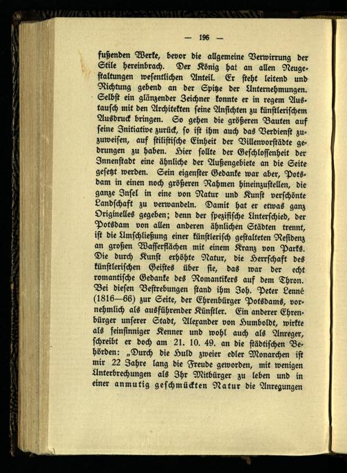 fußenden Werke, bevor die allgemeine Verwirrung der Stile hereinbrach. Der König hat an allen Neugestaltungen wesentlichen Anteil. Er steht leitend und Richtung gebend an der Spitze der Unternehmungen. Selbst ein glänzender Zeichner konnte er in regem Austausch mit den Architekten seine Ansichten zu künstlerischem Ausdruck bringen. So gehen die größeren Bauten auf seine Initiative zurück, so ist ihm auch das Verdienst zuzuweisen, auf stilistische Einheit der Villenvorstädte gedrungen zu haben. Hier sollte der Geschlossenheit der Innenstadt eine ähnliche der Außengebiete an die Seite gesetzt werden. Sein eigenster Gedanke war aber, Potsdam in einen noch größeren Rahmen hineinzustellen, die ganze Insel in eine von Natur und Kunst verschönte Landschaft zu verwandeln. Damit hat er etwas ganz Originelles gegeben; denn der spezifische Unterschied, der Potsdam von allen anderen ähnlichen Städten trennt, ist die Ausschließung einer künstlerisch gestalteten Residenz an großen Wasserflächen mit einem Kranz von Parks. Die durch Kunst erhöhte Natur, die Herrschaft des künstlerischen Geistes über sie, das war der echt romantische Gedanke des Romantikers auf dem Thron. Bei diesen Bestrebungen stand ihm Joh. Peter Lenné (1816—66) zur Seite, der Ehrenbürger Potsdams, vor- nehmlich als ausführender Künstler. Ein anderer Ehrenbürger unserer Stadt, Alexander von Humboldt, wirkte als feinsinniger Kenner und wohl auch als Anreger, schreibt er doch am 21.10.49. an die städtischen Behörden: „Durch die Huld zweier edler Monarchen ist mir 22 Jahre lang die Freude geworden, mit wenigen Unterbrechungen als Ihr Mitbürger zu leben und in einer anmutig geschmückten Natur die Anregungen