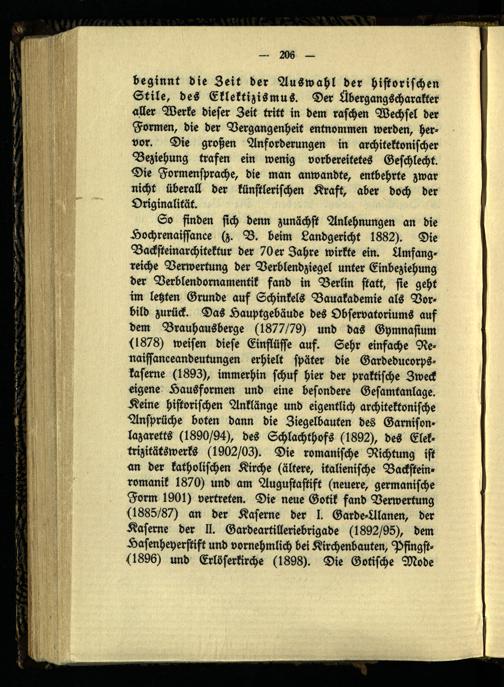 So finden sich denn zunächst Anlehnungen an die Hochrenaissance (z. B. beim Landgericht 1882). Die Backsteinarchitektur der 70 er Jahre wirkte ein. Umfangreiche Verwertung der Verblendziegel unter Einbeziehung der Verblendomamentik fand in Berlin statt, sie geht im letzten Grunde auf Schinkels Bauakademie als Vorbild zurück. Das Hauptgebäude des Observatoriums auf dem Brauhausberge (1877/79) und das Gymnasium (1878) weisen diese Einflüsse auf. Sehr einfache Re- naissanceandeutungen erhielt später die Gardeducorps- kaserne (1893), immerhin schuf hier der praktische Zweck eigene Hausformen und eine besondere Gesamtanlage. Keine historischen Anklänge und eigentlich architektonische Ansprüche boten dann die Ziegelbauten des Garnisonlazaretts (1890/94), des Schlachthofs (1892), des Elek- trizitätswerks (1902/03). Die romanische Richtung ist an der katholischen Kirche (ältere, italienische Backsteinromanik 1870) und am Augustastift (neuere, germanische Form 1901) vertreten. Die neue Gotik fand Verwertung (1885/87) an der Kaserne der I. Garde-Ulanen, der Kaserne der II. Gardeartilleriebrigade (1892/95), dem Hasenheyerstift und vornehmlich bei Kirchenbauten, Pfingst- (1896) und Erlöserkirche (1898). Die Gotische Mode