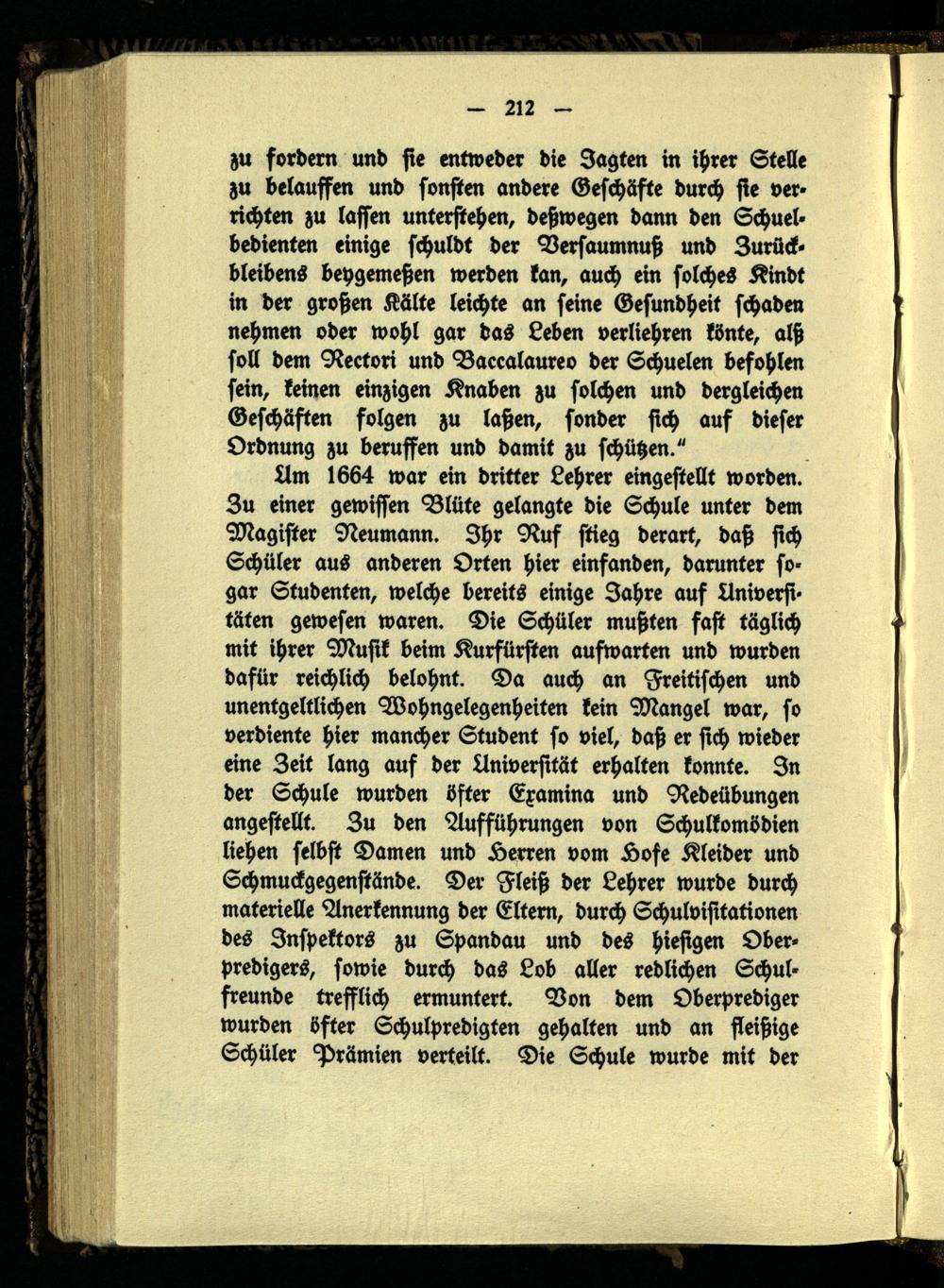 Um 1664 war ein dritter Lehrer eingestellt worden. Zu einer gewissen Blüte gelangte die Schule unter dem Magister Neumann. Ihr Ruf stieg derart, daß sich Schüler aus anderen Orten hier einfanden, darunter sogar Studenten, welche bereits einige Jahre auf Universi- täten gewesen waren. Die Schüler mußten fast täglich mit ihrer Musik beim Kurfürsten aufwarten und wurden dafür reichlich belohnt. Da auch an Freitischen und unentgeltlichen Wohngelegenheiten kein Mangel war, so verdiente hier mancher Student so viel, daß er sich wieder eine Zeit lang auf der Universität erhalten konnte. In der Schule wurden öfter Examina und Redeübungen angestellt. Zu den Aufführungen von Schulkomödien liehen selbst Damen und Herren vom Hofe Kleider und Schmuckgegenstände. Der Fleiß der Lehrer wurde durch materielle Anerkennung der Eltern, durch Schulvisitationen des Inspektors zu Spandau und des hiesigen Ober- Predigers, sowie durch das Lob aller redlichen Schulfreunde trefflich ermuntert. Von dem Oberprediger wurden öfter Schulpredigten gehalten und an fleißige Schüler Prämien verteilt. Die Schule wurde mit der