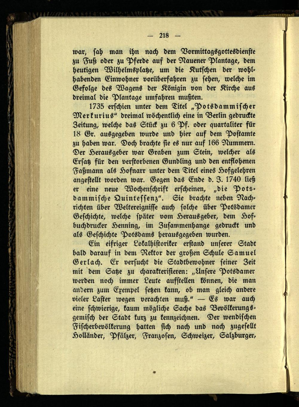 Ein eifriger Lokalhistoriker erstand unserer Stadt bald darauf in dem Rektor der großen Schule Samuel Ger lach. Er versucht die Stadtbewohner seiner Zeit mit dem Satze zu charakterisieren: „Ansere Potsdamer werden noch immer Leute aufstellen können, die man andern zum Exempel setzen kann, ob man gleich andere vieler Laster wegen verachten muß." — Es war auch eine schwierige, kaum mögliche Sache das Bevölkerungsgemisch der Stadt kurz zu kennzeichnen. Der wendischen Fischerbevölkerung hatten sich nach und nach zugesellt Holländer, Pfälzer, Franzosen, Schweizer, Salzburger,