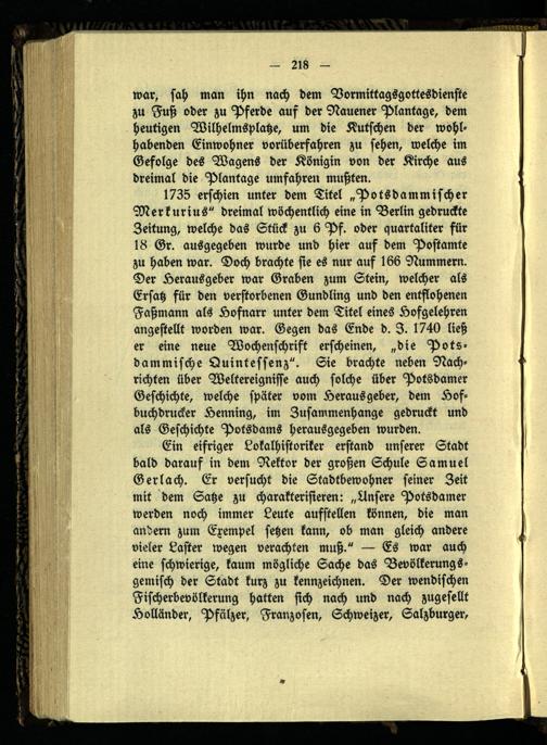 1735 erschien unter dem Titel „Potsdammischer Merkurius" dreimal wöchentlich eine in Berlin gedruckte Zeitung, welche das Stück zu 6 Pf. oder quartaliter für 18 Gr. ausgegeben wurde und hier auf dem Postamte zu haben war. Doch brachte sie es nur auf 166 Nummern. Der Herausgeber war Graben zum Stein, welcher als Ersah für den verstorbenen Gundling und den entflohenen Faßmann als Hofnarr unter dem Titel eines Hofgelehren angestellt worden war. Gegen das Ende d. I. 1740 ließ er eine neue Wochenschrift erscheinen, „die Potsdammische Quintessenz". Sie brachte neben Nachrichten über Weltereigniffe auch solche über Potsdamer Geschichte, welche später vom Herausgeber, dem Hofbuchdrucker Henning, im Zusammenhänge gedruckt und als Geschichte Potsdams herausgegeben wurden.