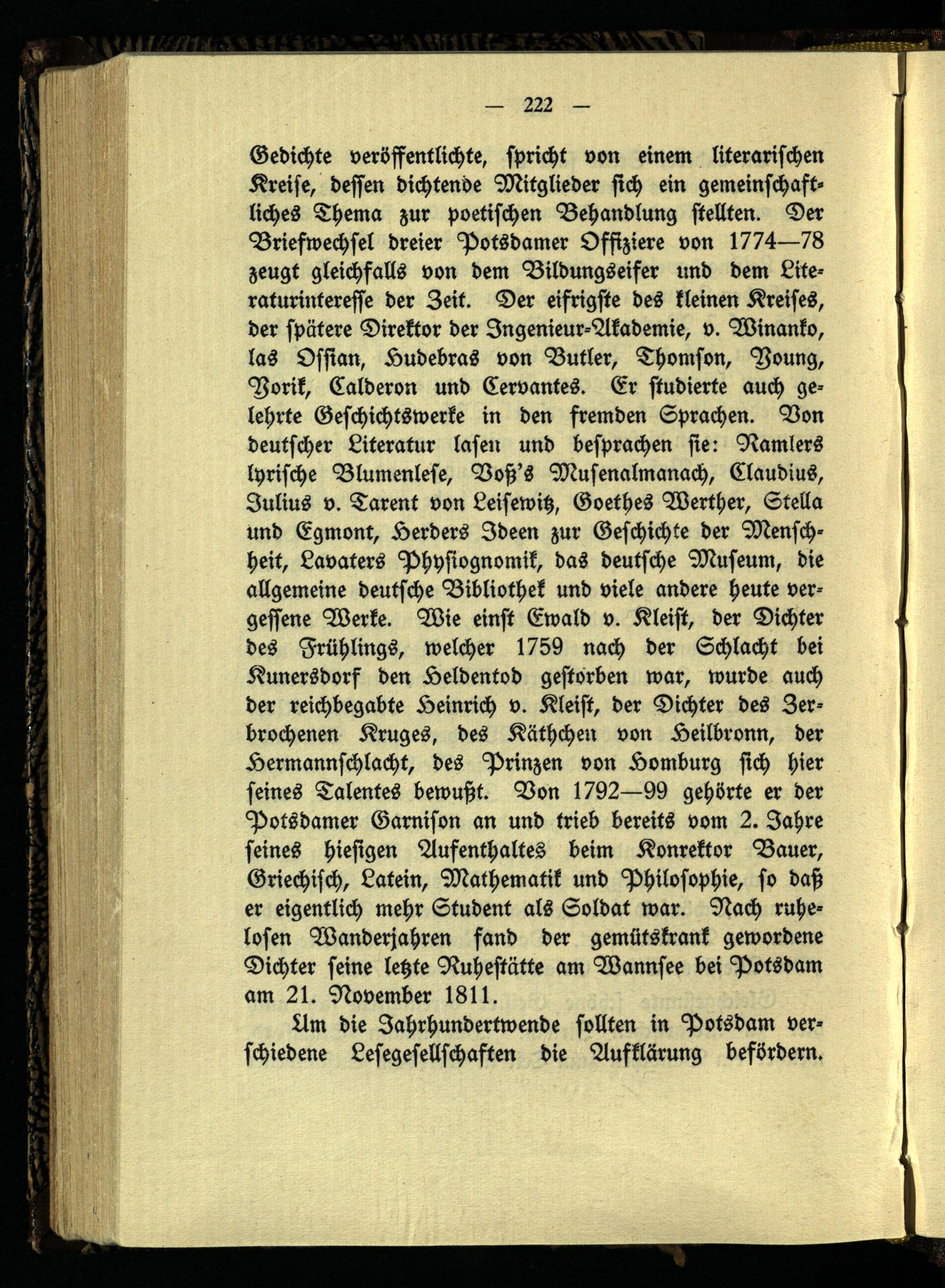 Gedichte veröffentlichte, spricht von einem literarischen Kreise, dessen dichtende Mitglieder sich ein gemeinschaftliches Thema zur poetischen Behandlung stellten. Der Briefwechsel dreier Potsdamer Offiziere von 1774—78 zeugt gleichfalls von dem Bildungseifer und dem Literaturinteresse der Zeit. Der eifrigste des kleinen Kreises, der spätere Direktor der Ingenieur-Akademie, v. Winanko, las Ossian, Hudebras von Butler, Thomson, Young, Borik, Calderon und Cervantes. Er studierte auch gelehrte Geschichtswerke in den fremden Sprachen. Von deutscher Literatur lasen und besprachen sie: Ramlers lyrische Blumenlese, Voß's Musenalmanach, Claudius, Julius v. Tarent von Leisewitz, Goethes Werther, Stella und Egmont, Herders Ideen zur Geschichte der Menschheit, Lavaters Physiognomik, das deutsche Museum, die allgemeine deutsche Bibliothek und viele andere heute vergessene Werke. Wie einst Ewald v. Kleist, der Dichter des Frühlings, welcher 1759 nach der Schlacht bei Kunersdorf den Heldentod gestorben war, wurde auch der reichbegabte Heinrich v. Kleist, der Dichter des Zerbrochenen Kruges, des Käthchen von Heilbronn, der Hermannschlacht, des Prinzen von Homburg sich hier seines Talentes bewußt. Von 1792—99 gehörte er der Potsdamer Garnison an und trieb bereits vom 2. Jahre seines hiesigen Aufenthaltes beim Konrektor Bauer, Griechisch, Latein, Mathematik und Philosophie, so daß er eigentlich mehr Student als Soldat war. Nach ruhelosen Wanderjahren fand der gemütskrank gewordene Dichter seine letzte Ruhestätte am Wannsee bei Potsdam am 21. November 1811.