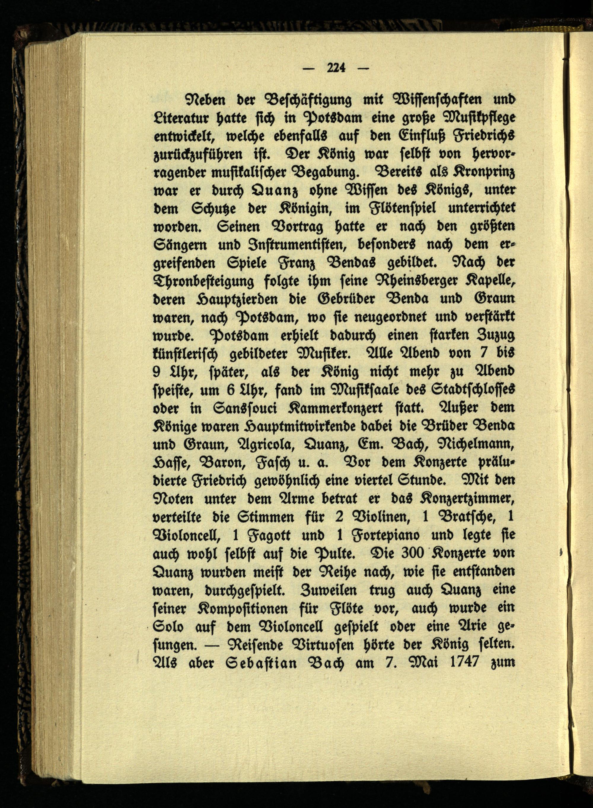 Neben der Beschäftigung mit Wissenschaften und Literatur hatte sich in Potsdam eine große Musikpfiege entwickelt, welche ebenfalls aus den Einfluß Friedrichs zurückzuführen ist. Der König war selbst von hervorragender musikalischer Begabung. Bereits als Kronprinz war er durch Quanz ohne Wissen des Königs, unter dem Schutze der Königin, im Flötenspiel unterrichtet worden. Seinen Vortrag hatte er nach den größten Sängern und Instrumentisten, besonders nach dem ergreifenden Spiele Franz Bendas gebildet. Nach der Thronbesteigung folgte ihm seine Rheinsberger Kapelle, deren Hauptzierden die Gebrüder Benda und Graun waren, nach Potsdam, wo sie neugeordnet und verstärkt wurde. Potsdam erhielt dadurch einen starken Zuzug künstlerisch gebildeter Musiker. Alle Abend von 7 bis 9 Uhr, später, als der König nicht mehr zu Abend speiste, um 6 Uhr, fand im Musiksaale des Stadtschlosses oder in Sanssouci Kammerkonzert statt. Außer dem Könige waren Hauptmitwirkende dabei die Brüder Benda und Graun, Agricola, Quanz, Em. Bach, Nichelmann, Lasse, Baron, Fasch u. a. Vor dem Konzerte präludierte Friedrich gewöhnlich eine viertel Stunde. Mit den Noten unter dem Arme betrat er das Konzertzimmer, verteilte die Stimmen für 2 Violinen, 1 Bratsche, 1 Violoncelli, 1 Fagott und 1 Fortepiano und legte sie auch wohl selbst auf die Pulte. Die 300 Konzerte von Quanz wurden meist der Reihe nach, wie sie entstanden waren, durchgespielt. Zuweilen trug auch Quanz eine seiner Kompositionen für Flöte vor, auch wurde ein Solo auf dem Violoncell gespielt oder eine Arie ge- sungen. — Reisende Virtuosen hörte der König selten. Als aber Sebastian Bach am 7. Mai 1747 zum