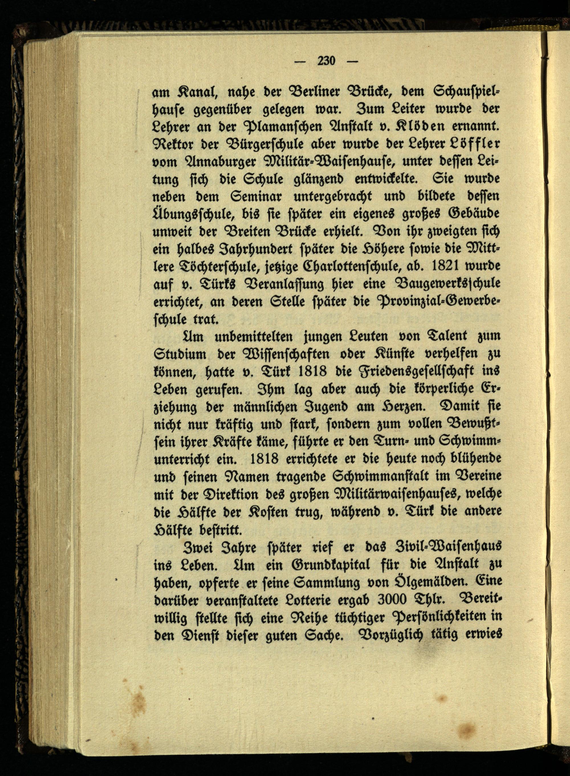 am Kanal, nahe der Berliner Brücke, dem Schauspielhause gegenüber gelegen war. Zum Leiter wurde der Lehrer an der Plamanschen Anstalt v. Klöden ernannt. Rektor der Bürgerschule aber wurde der Lehrer Löffler vom Annaburger Militär-Waisenhause, unter dessen Leitung sich die Schule glänzend entwickelte. Sie wurde neben dem Seminar untergebracht und bildete dessen Übungsschule, bis sie später ein eigenes großes Gebäude unweit der Breiten Brücke erhielt. Von ihr zweigten sich ein halbes Jahrhundert später die Höhere sowie die Mittlere Töchterschule, jetzige Charlottenschule, ab. 1821 wurde auf v. Türks Veranlassung hier eine Baugewerkschule errichtet, an deren Stelle später die Provinzial-Gewerbe- schule trat.