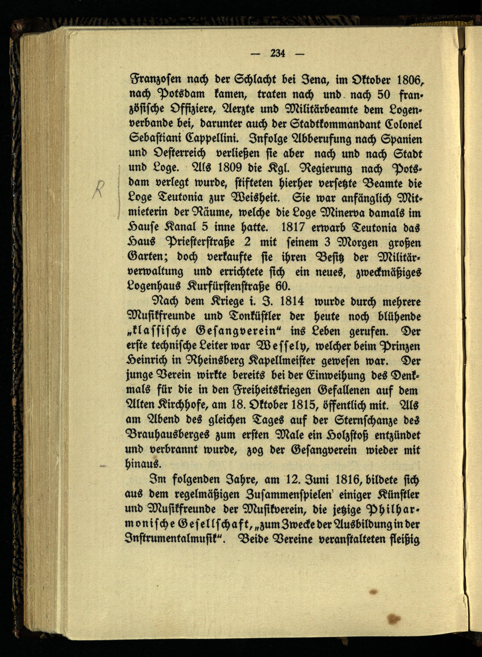 Franzosen nach der Schlacht bei Jena, im Oktober 1806, nach Potsdam kamen, traten nach und nach 50 französische Offiziere, Aerzte und Militärbeamte dem Logen- verbande bei, darunter auch der Stadtkommandant Colonel Sebastiani Cappellini. Infolge Abberufung nach Spanien und Oesterreich verließen sie aber nach und nach Stadt und Loge. Als 1809 die Kgl. Regierung nach Potsdam verlegt wurde, stifteten hierher versetzte Beamte die Loge Teutonia zur Weisheit. Sie war anfänglich Mitmieterin der Räume, welche die Loge Minerva damals im Hause Kanal 5 inne hatte. 1817 erwarb Teutonia das Haus Priesterstraße 2 mit seinem 3 Morgen großen Garten; doch verkaufte sie ihren Besitz der Militärverwaltung und errichtete sich ein neues, zweckmäßiges Logenhaus Kurfürstenstraße 60.