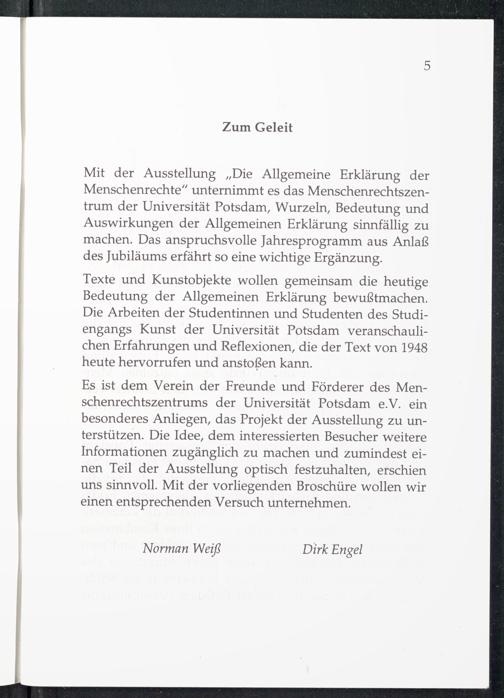 Es ist dem Verein der Freunde und Förderer des Menschenrechtszentrums der Universität Potsdam e.V. ein besonderes Anliegen, das Projekt der Ausstellung zu unterstützen. Die Idee, dem interessierten Besucher weitere Informationen zugänglich zu machen und zumindest einen Teil der Ausstellung optisch festzuhalten, erschien uns sinnvoll. Mit der vorliegenden Broschüre wollen wir einen entsprechenden Versuch unternehmen.
