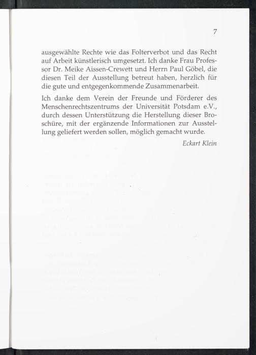 Ich danke dem Verein der Freunde und Förderer des Menschenrechtszentrums der Universität Potsdam e.V., durch dessen Unterstützung die Herstellung dieser Broschüre, mit der ergänzende Informationen zur Ausstellung geliefert werden sollen, möglich gemacht wurde.