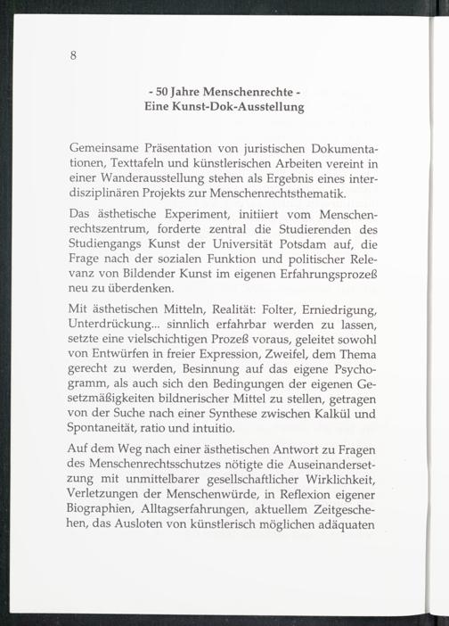 Das ästhetische Experiment, initiiert vom Menschenrechtszentrum, forderte zentral die Studierenden des Studiengangs Kunst der Universität Potsdam auf, die Frage nach der sozialen Funktion und politischer Relevanz von Bildender Kunst im eigenen Erfahrungsprozeß neu zu überdenken.