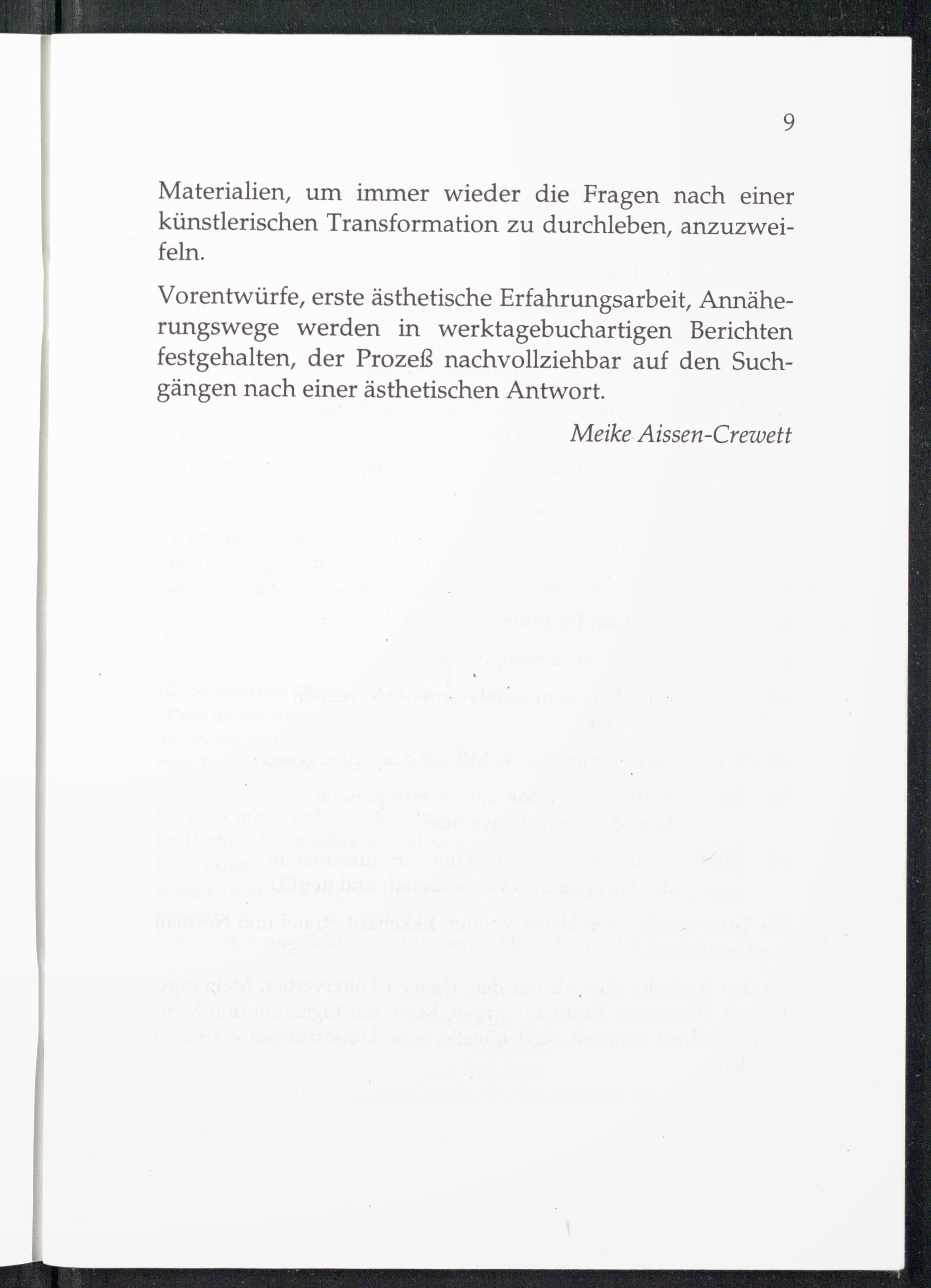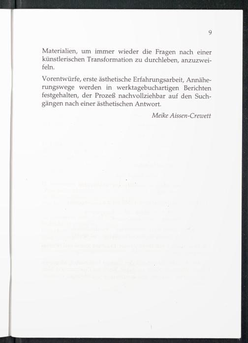 Vorentwürfe, erste ästhetische Erfahrungsarbeit, Annäherungswege werden in werktagebuchartigen Berichten festgehalten, der Prozeß nachvollziehbar auf den Suchgängen nach einer ästhetischen Antwort.