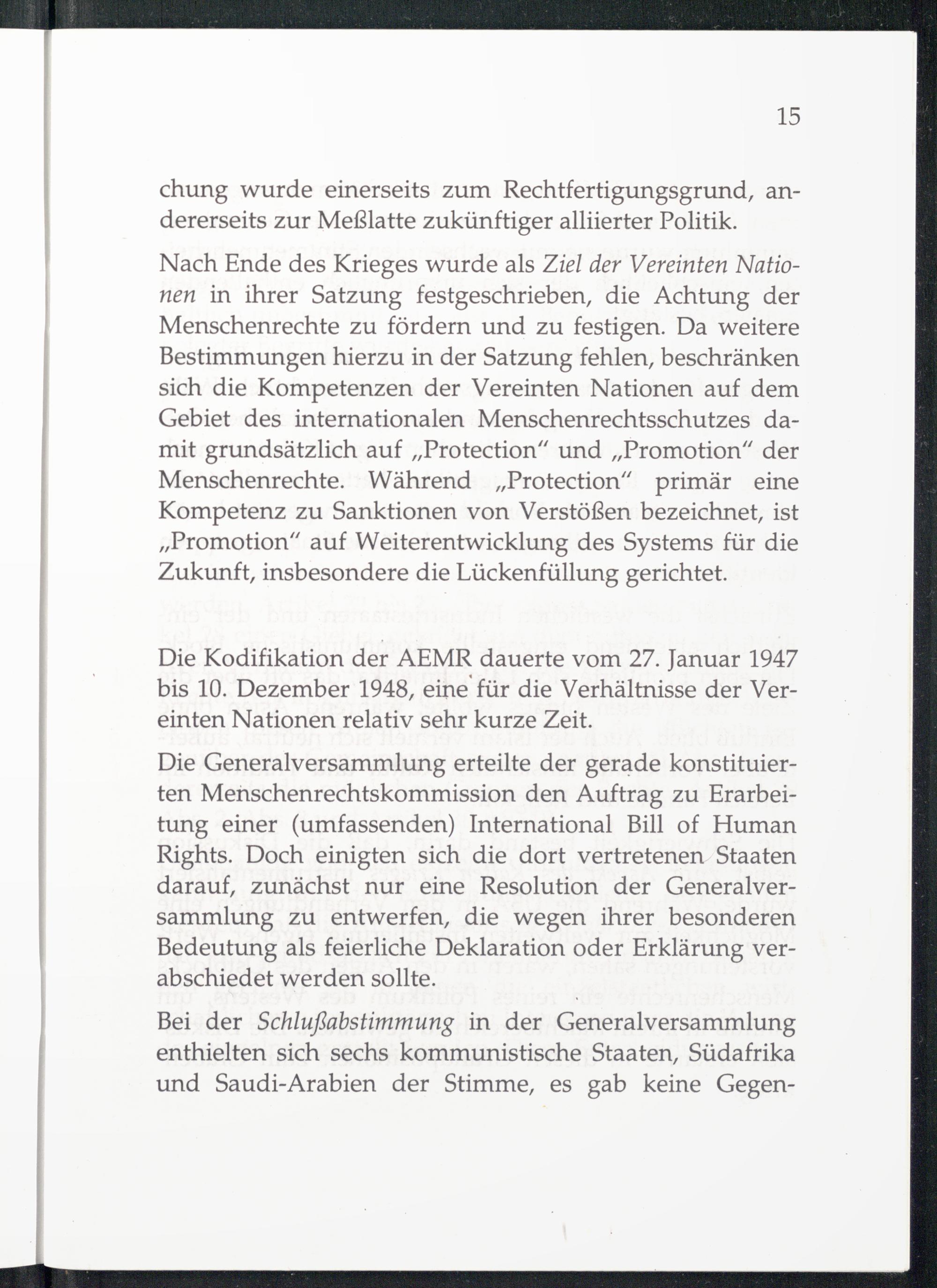 Nach Ende des Krieges wurde als Ziel der Vereinten Nationen in ihrer Satzung festgeschrieben, die Achtung der Menschenrechte zu fördern und zu festigen. Da weitere Bestimmungen hierzu in der Satzung fehlen, beschränken sich die Kompetenzen der Vereinten Nationen auf dem Gebiet des internationalen Menschenrechtsschutzes damit grundsätzlich auf„Protection“ und„Promotion“ der Menschenrechte. Während„Protection“ primär eine Kompetenz zu Sanktionen von Verstößen bezeichnet, ist „Promotion“ auf Weiterentwicklung des Systems für die Zukunft, insbesondere die Lückenfüllung gerichtet.
