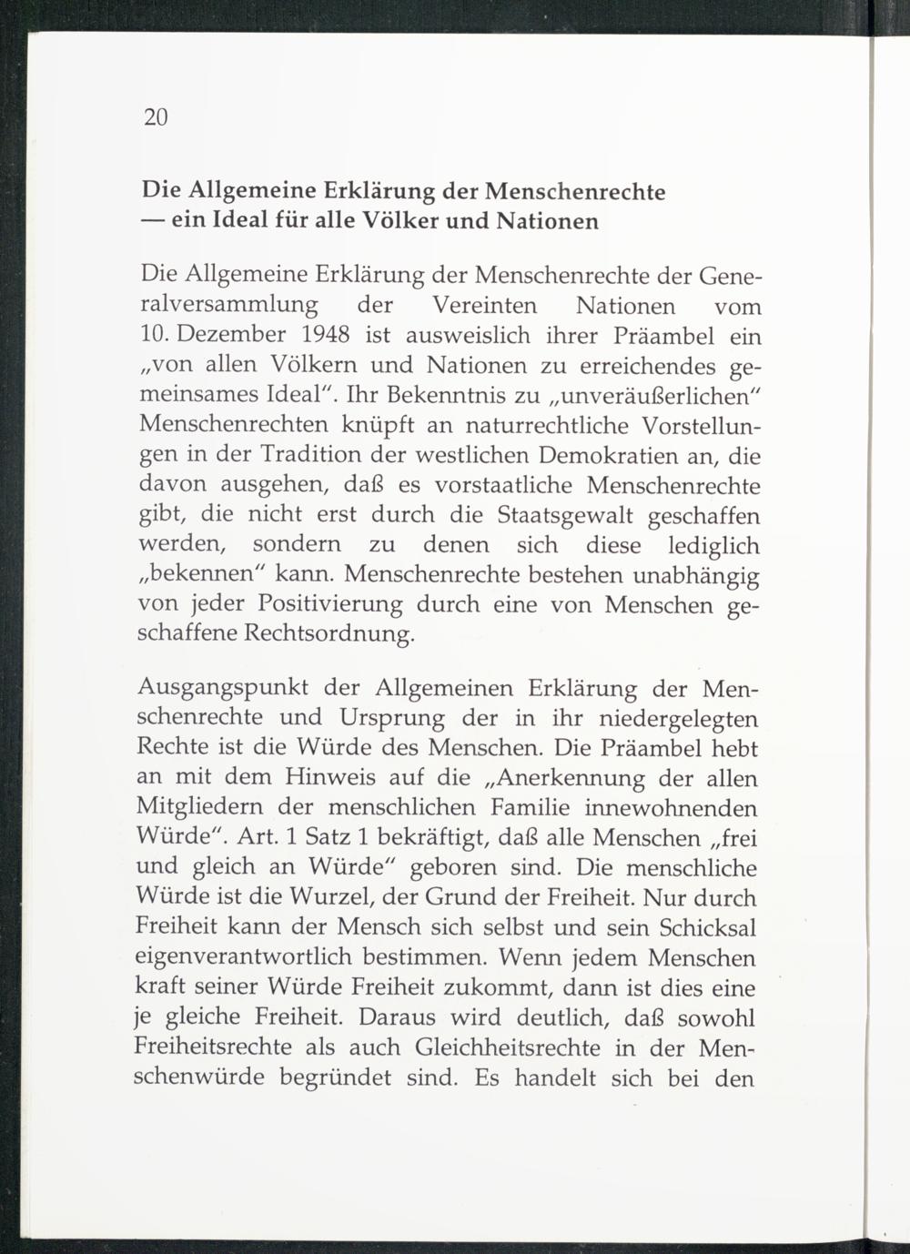 Ausgangspunkt der Allgemeinen Erklärung der Menschenrechte und Ursprung der in ihr niedergelegten Rechte ist die Würde des Menschen. Die Präambel hebt an mit dem Hinweis auf die„Anerkennung der allen Mitgliedern der menschlichen Familie innewohnenden Würde“. Art. 1 Satz 1 bekräftigt, daß alle Menschen„frei und gleich an Würde“ geboren sind. Die menschliche Würde ist die Wurzel, der Grund der Freiheit. Nur durch Freiheit kann der Mensch sich selbst und sein Schicksal eigenverantwortlich bestimmen. Wenn jedem Menschen kraft seiner Würde Freiheit zukommt, dann ist dies eine je gleiche Freiheit. Daraus wird deutlich, daß sowohl Freiheitsrechte als auch Gleichheitsrechte in der Menschenwürde begründet sind. Es handelt sich bei den