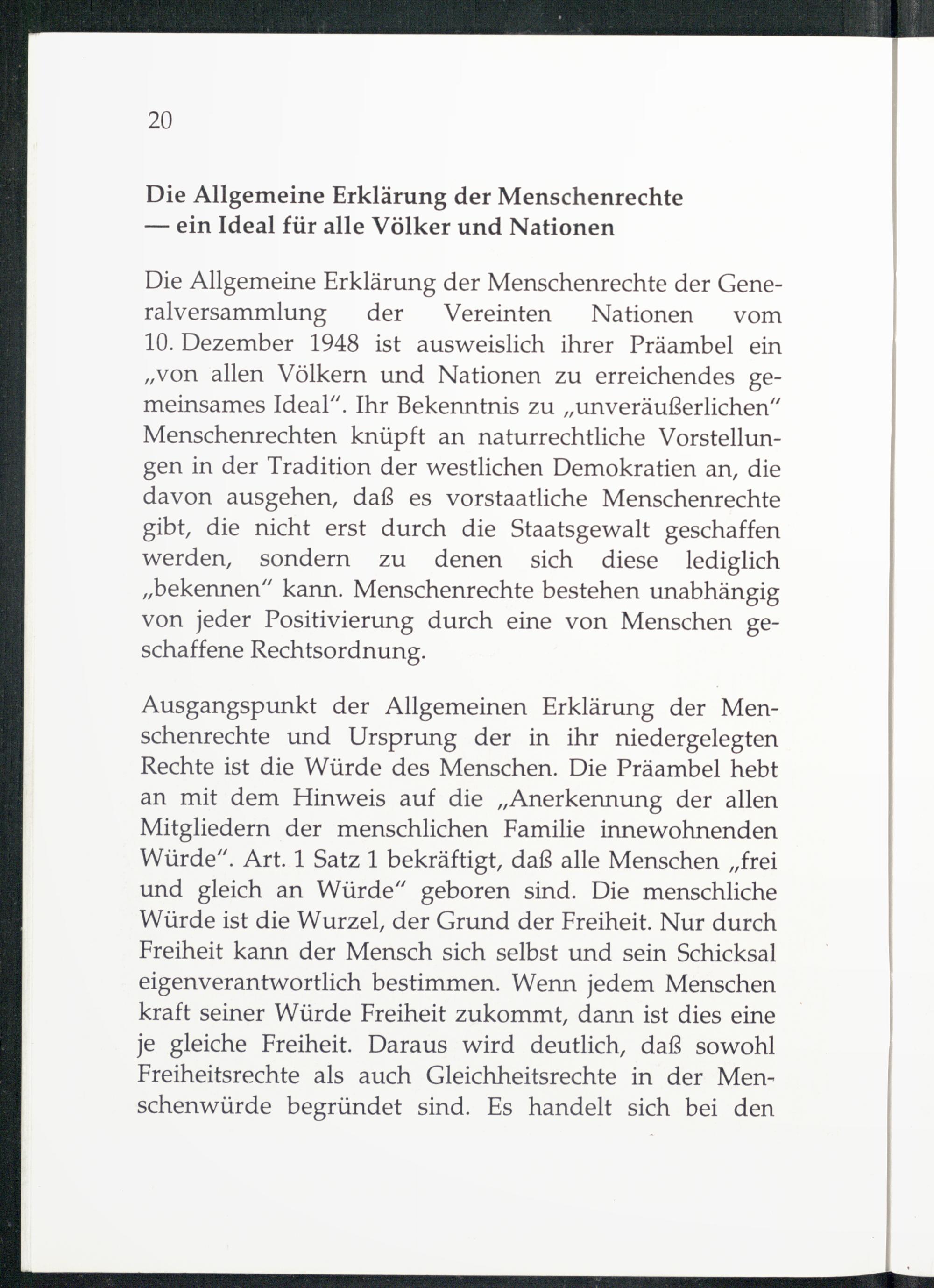 Die Allgemeine Erklärung der Menschenrechte der Generalversammlung der Vereinten Nationen vom 10. Dezember 1948 ist ausweislich ihrer Präambel ein „von allen Völkern und Nationen zu erreichendes gemeinsames Ideal“. Ihr Bekenntnis zu„unveräußerlichen“ Menschenrechten knüpft an naturrechtliche Vorstellungen in der Tradition der westlichen Demokratien an, die davon ausgehen, daß es vorstaatliche Menschenrechte gibt, die nicht erst durch die Staatsgewalt geschaffen werden, sondern zu denen sich diese lediglich „bekennen“ kann. Menschenrechte bestehen unabhängig von jeder Positivierung durch eine von Menschen geschaffene Rechtsordnung.