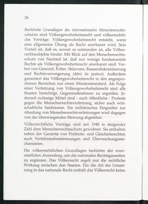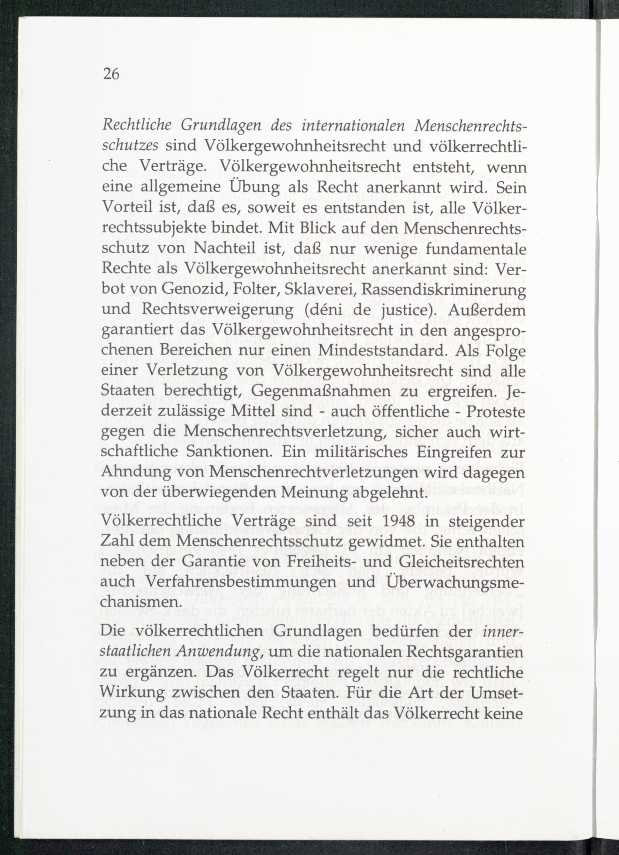 Rechtliche Grundlagen des internationalen Menschenrechtsschutzes sind Völkergewohnheitsrecht und völkerrechtliche Verträge. Völkergewohnheitsrecht entsteht, wenn eine allgemeine Übung als Recht anerkannt wird. Sein Vorteil ist, daß es, soweit es entstanden ist, alle Völkerrechtssubjekte bindet. Mit Blick auf den Menschenrechtsschutz von Nachteil ist, daß nur wenige fundamentale Rechte als Völkergewohnheitsrecht anerkannt sind: Verbot von Genozid, Folter, Sklaverei, Rassendiskriminerung und Rechtsverweigerung(deni de justice). Außerdem garantiert das Völkergewohnheitsrecht in den angesprochenen Bereichen nur einen Mindeststandard. Als Folge einer Verletzung von Völkergewohnheitsrecht sind alle Staaten berechtigt, Gegenmaßnahmen zu ergreifen. Jederzeit zulässige Mittel sind- auch öffentliche- Proteste gegen die Menschenrechtsverletzung, sicher auch wirtschaftliche Sanktionen. Ein militärisches Eingreifen zur Ahndung von Menschenrechtverletzungen wird dagegen von der überwiegenden Meinung abgelehnt.