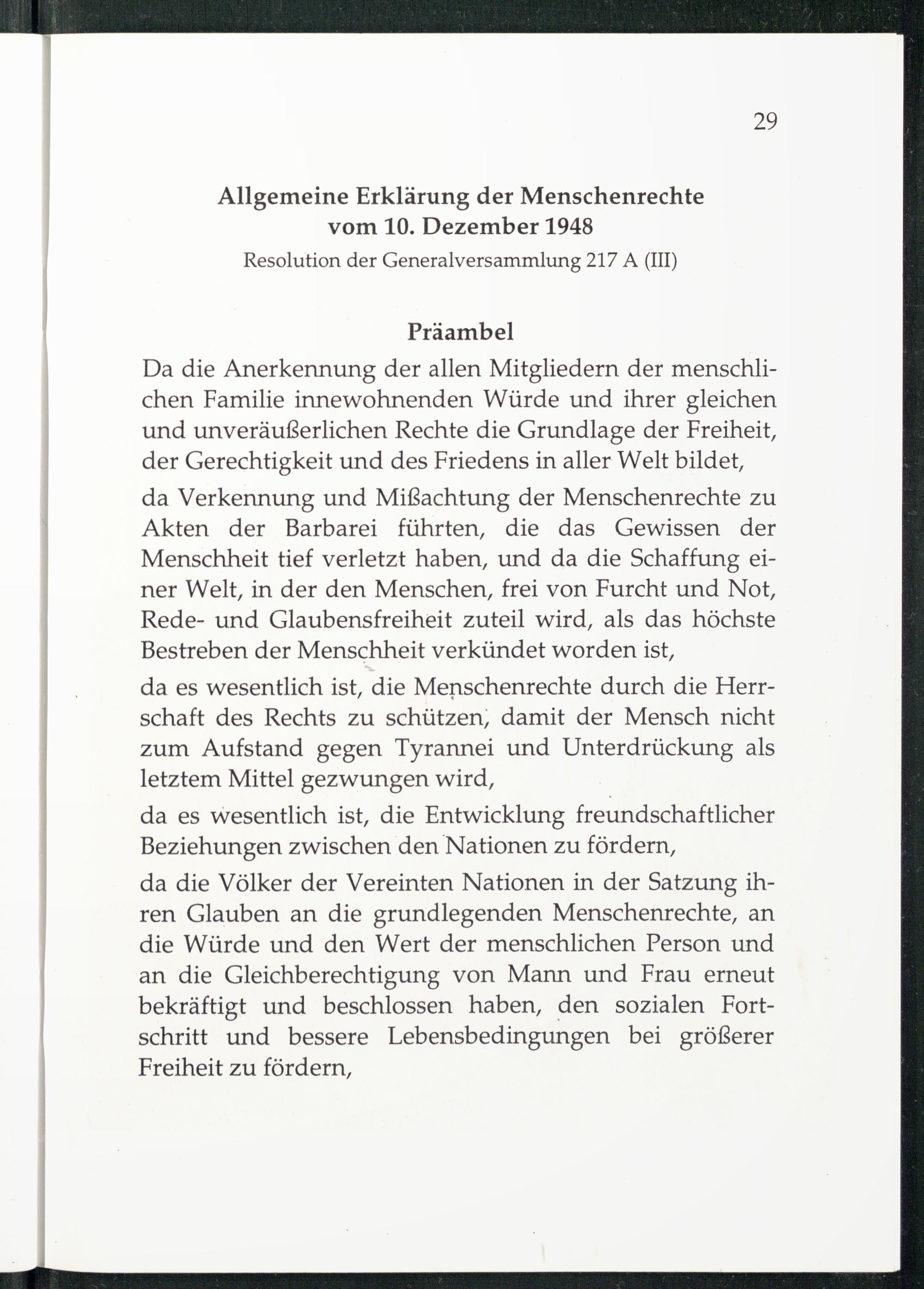 Da die Anerkennung der allen Mitgliedern der menschlichen Familie innewohnenden Würde und ihrer gleichen und unveräußerlichen Rechte die Grundlage der Freiheit, der Gerechtigkeit und des Friedens in aller Welt bildet,