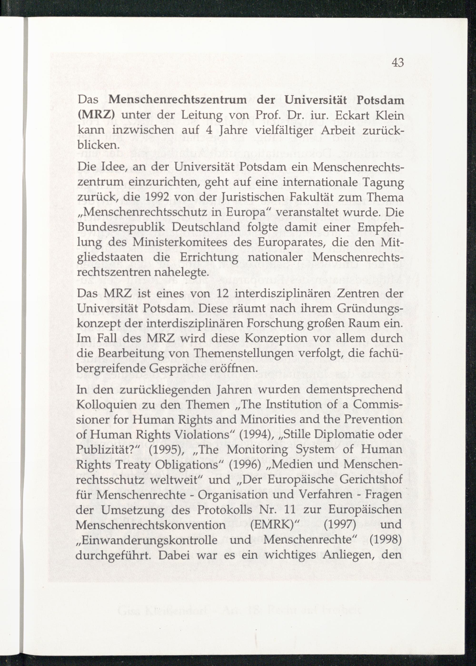 Das Menschenrechtszentrum der Universität Potsdam (MRZ) unter der Leitung von Prof. Dr. iur. Eckart Klein kann inzwischen auf 4 Jahre vielfältiger Arbeit zurückblicken.