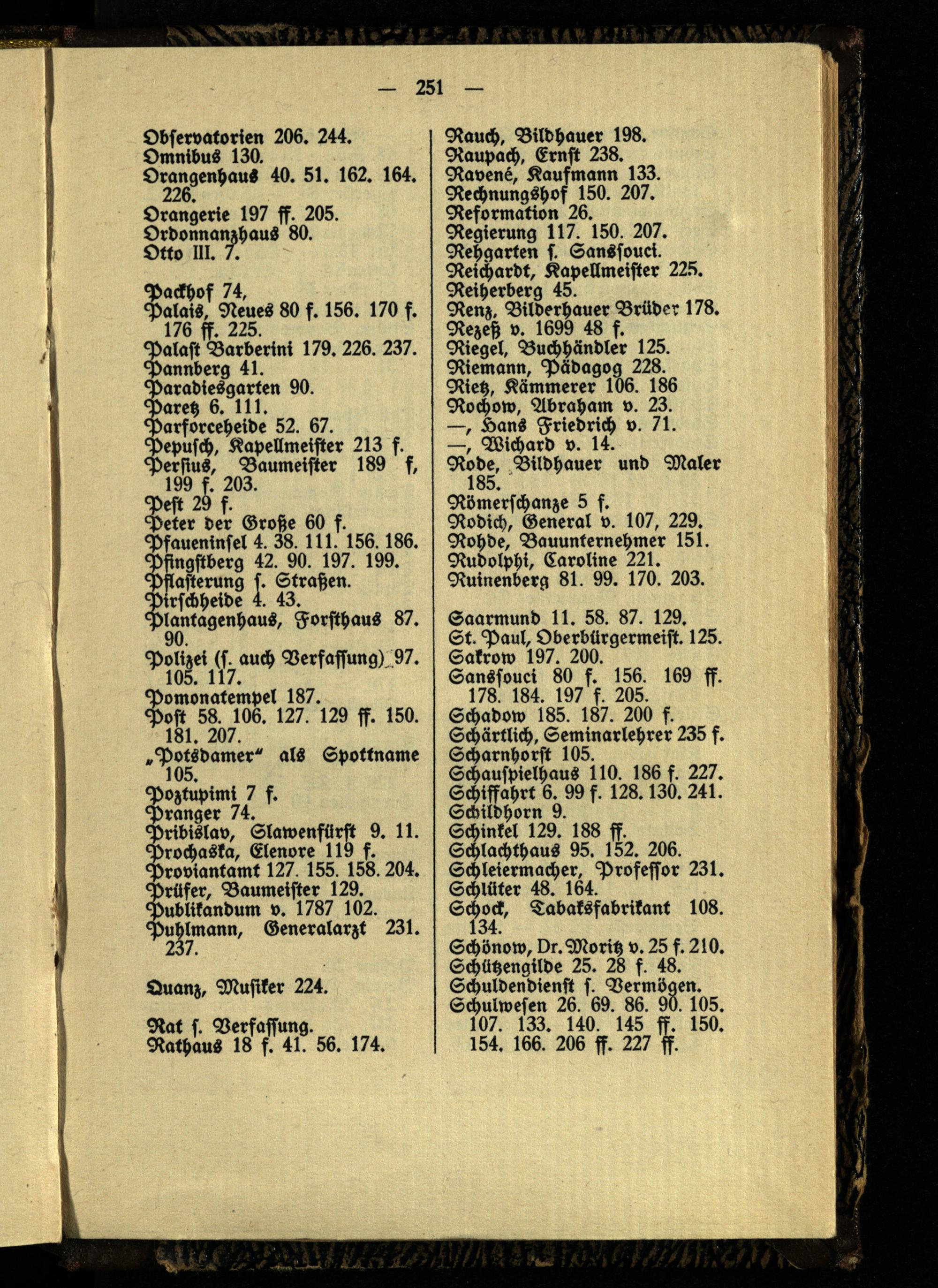 Regierung 117. 150. 207. Rehgarten s. Sanssouci. Reichardt, Kapellmeister 225. Reiherberg 45.