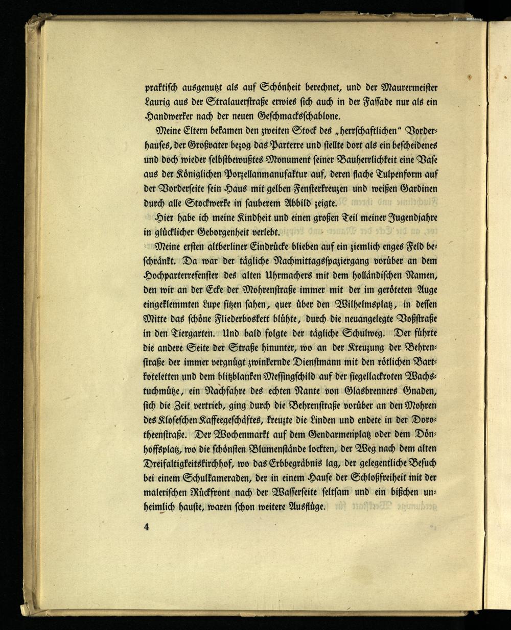 Meine ersten altberliner Eindrücke blieben auf ein ziemlich enges Feld beschränkt. Da war der tägliche Nachmittagsspaziergang vorüber an dem Hochparterrefenster des alten Uhrmachers mit dem holländischen Namen, den wir an der Ecke der Mohrenstraße immer mit der im geröteten Auge eingeklemmten Lupe sitzen sahen, quer über den Wilhelmsplatz, in dessen Mitte das schöne Fliederboskett blühte, durch die neuangelegte Voßstraße in den Tiergarten. Und bald folgte der tägliche Schulweg. Der führte die andere Seite der Straße hinunter, wo an der Kreuzung der Behrenstraße der immer vergnügt zwinkernde Dienstmann mit den rötlichen Bartkoteletten und dem blitzblanken Messingschild auf der siegellackroten Wachstuchmütze, ein Nachfahre des echten Nante von Glasbrenners Gnaden, sich die Zeit vertrieb, ging durch die Behrenstraße vorüber an den Mohren des Kloseschen Kaffeegeschäftes, kreuzte die Linden und endete in der Dorotheenstraße. Der Wochenmarkt auf dem Gendarmenplatz oder dem Dönhoffsplatz, wo die schönsten Blumenstände lockten, der Weg nach dem alten Dreifaltigkeitskirchhof, wo das Erbbegräbnis lag, der gelegentliche Besuch bei einem Schulkameraden, der in einem Hause der Schloßfreiheit mit der malerischen Rückfront nach der Wasserseite seltsam und ein bißchen unheimlich hauste, waren schon weitere Ausflüge.