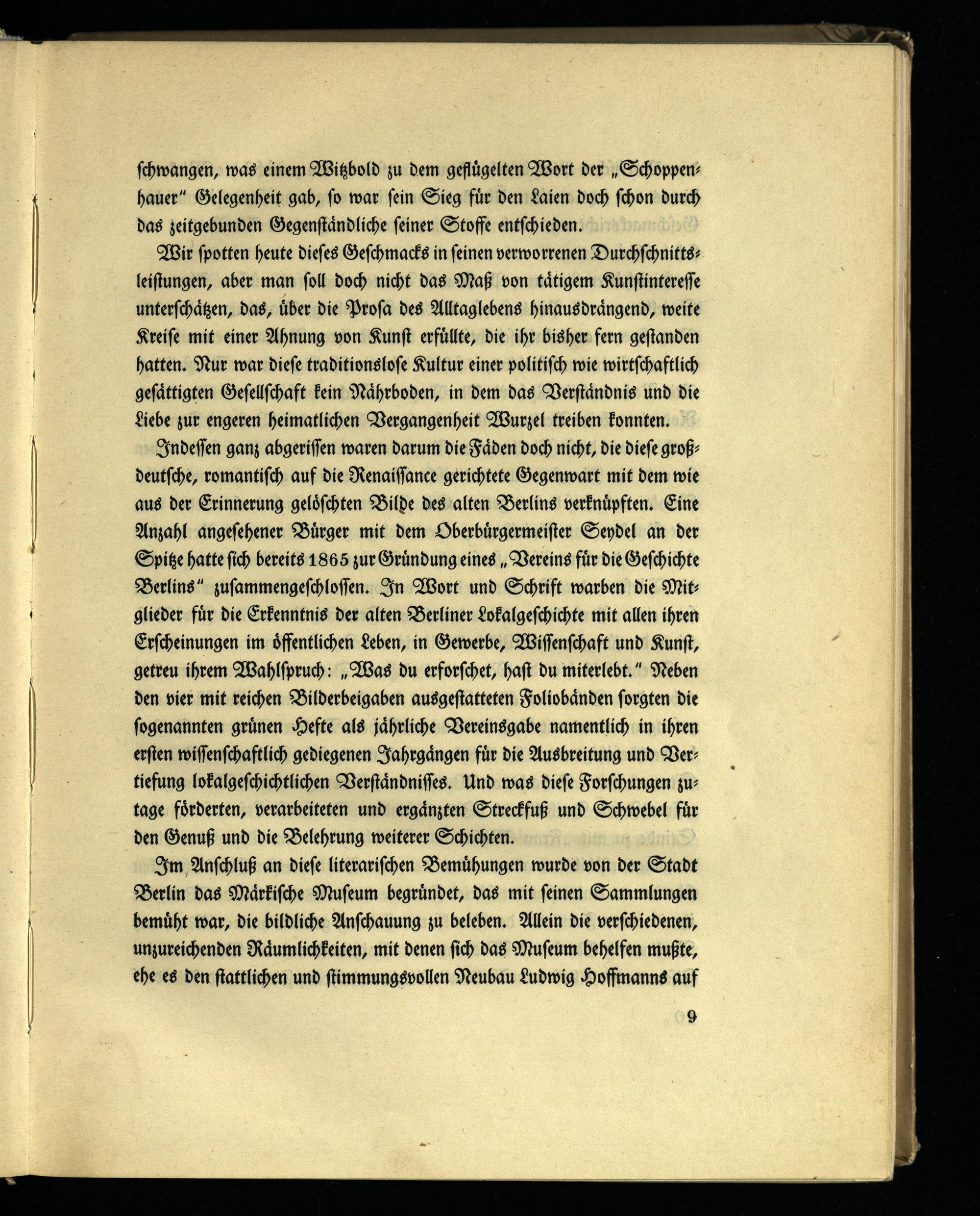 Indessen ganz abgerissen waren darum die Fäden doch nicht, die diese großdeutsche, romantisch auf die Renaissance gerichtete Gegenwart mit dem wie aus der Erinnerung gelöschten Bilde des alten Berlins verknüpften. Eine Anzahl angesehener Bürger mit dem Oberbürgermeister Seydel an der Spitze hatte sich bereits 1865 zur Gründung eines „Vereins für die Geschichte Berlins" zusammengeschlossen. In Wort und Schrift warben die Mitglieder für die Erkenntnis der alten Berliner Lokalgeschichte mit allen ihren Erscheinungen im öffentlichen Leben, in Gewerbe, Wissenschaft und Kunst, getreu ihrem Wahlspruch: „Was du erforschet, hast du miterlebt. " Neben den vier mit reichen Bilderbeigaben ausgestatteten Foliobänden sorgten die sogenannten grünen Hefte als jährliche Vereinsgabe namentlich in ihren ersten wissenschaftlich gediegenen Jahrgängen für die Ausbreitung und Vertiefung lokalgeschichtlichen Verständnisses. Und was diese Forschungen zutage förderten, verarbeiteten und ergänzten Streckfuß und Schwebel für den Genuß und die Belehrung weiterer Schichten.