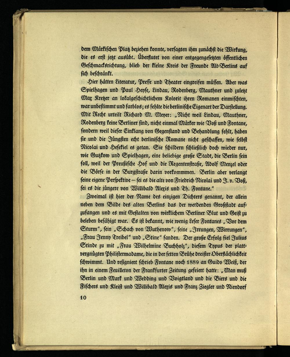 Hier hätten Literatur, Presse und Theater eingreifen müssen. Aber was Spielhagen und Paul Heyse, Lindau, Rodenberg, Mauthner und zuletzt Max Kretzer an lokalgeschichtlichem Kolorit ihren Romanen einmischten, war unbestimmt und farblos; es fehlte die berlinische Eigenart der Darstellung. Mit Recht urteilt Richard M. Meyer: „Nicht weil Lindau, Mauthner, Rodenberg keine Berliner sind, nicht einmal Märker wie Voß und Fontane, sondern weil dieser Einklang von Gegenstand und Behandlung fehlt, haben sie und die Jüngsten echt berlinische Romane nicht geschaffen, wie selbst Nicolai und Hesekiel es getan. Sie schildern schließlich doch wieder nur, wie Gutzkow und Spielhagen, eine beliebige große Stadt, die Berlin sein soll, weil der Preußische Hof und die Regentenstraße, Adolf Menzel oder die Börse in der Burgsiraße darin vorkommmen. Berlin aber verlangt seine eigene Perspektive — sei es die alte von Friedrich Nicolai und I. v. Voß, sei es die jüngere von Willibald Alexis und Th. Fontane."