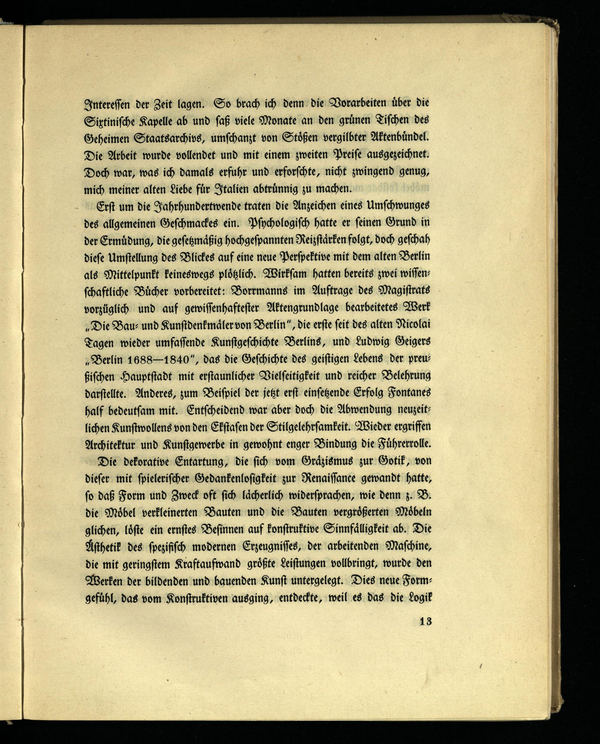 Erst um die Jahrhundertwende traten die Anzeichen eines Umschwunges des allgemeinen Geschmackes ein. Psychologisch hatte er seinen Grund in der Ermüdung, die gesetzmäßig hochgespannten Reizstärken folgt, doch geschah diese Umstellung des Blickes auf eine neue Perspektive mit dem alten Berlin als Mittelpunkt keineswegs plötzlich. Wirksam hatten bereits zwei wissenschaftliche Bücher vorbereitet: Borrmanns im Aufträge des Magistrats vorzüglich und auf gewissenhaftester Aktengrundlage bearbeitetes Werk „Die Bau- und Kunstdenkmäler von Berlin", die erste seit des alten Nicolai Tagen wieder umfassende Kunstgeschichte Berlins, und Ludwig Geigers „Berlin 1688—1840", das die Geschichte des geistigen Lebens der preußischen Hauptstadt mit erstaunlicher Vielseitigkeit und reicher Belehrung darstellte. Anderes, zum Beispiel der jetzt erst einsetzende Erfolg Fontanes half bedeutsam mit. Entscheidend war aber doch die Abwendung neuzeitlichen Kunstwollens von den Ekstasen der Stilgelehrsamkeit. Wieder ergriffen Architektur und Kunstgewerbe in gewohnt enger Bindung die Führerrolle.