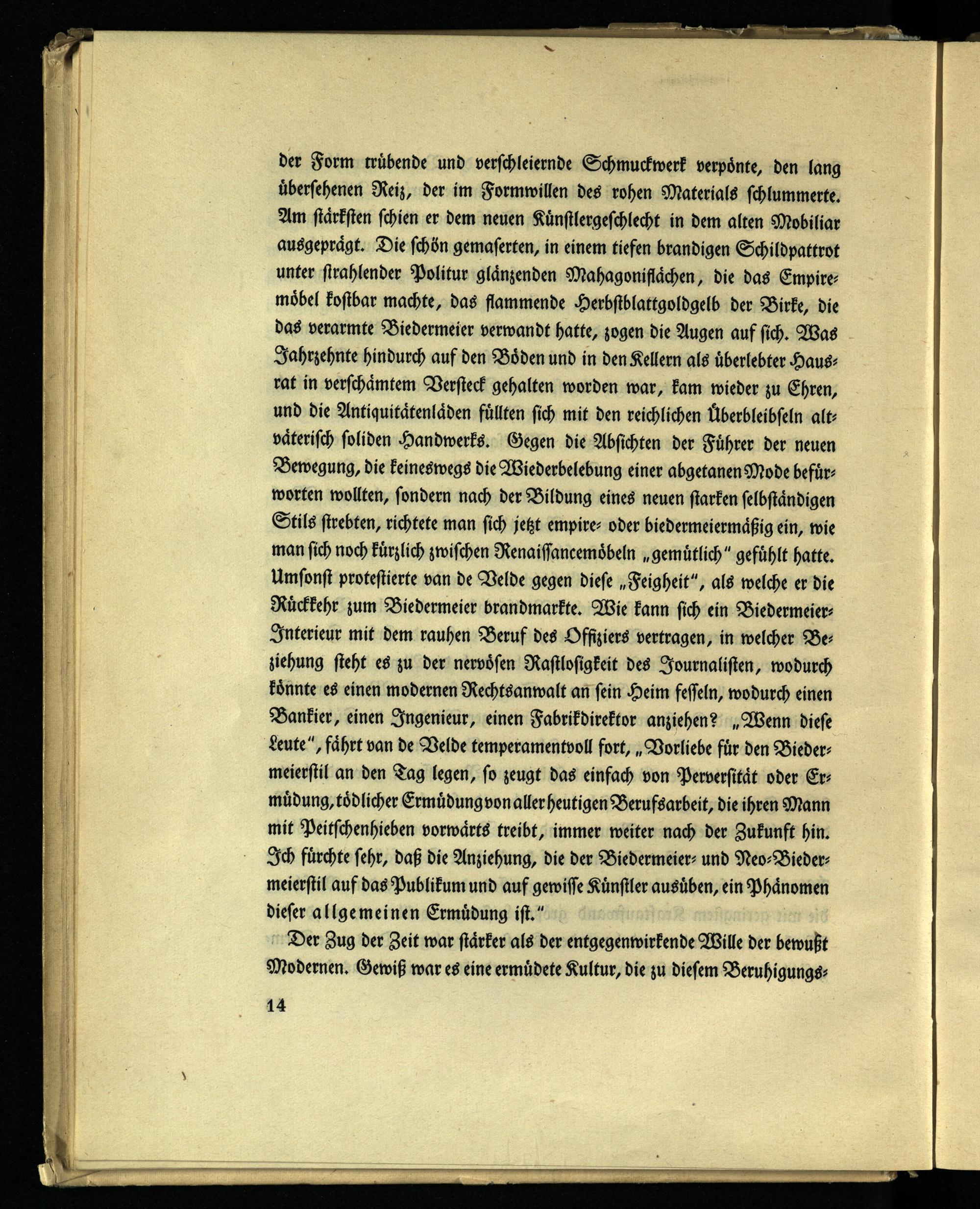 der Form trübende und verschleiernde Schmuckwerk verpönte, den lang übersehenen Reiz, der im Formwillen des rohen Materials schlummerte. Am stärksten schien er dem neuen Künstlergeschlecht in dem alten Mobiliar ausgeprägt. Die schön gemaserten, in einem tiefen brandigen Schildpattrot unter strahlender Politur glänzenden Mahagoniflächen, die das Empiremöbel kostbar machte, das flammende Herbstblattgoldgelb der Birke, die das verarmte Biedermeier verwandt hatte, zogen die Augen auf sich. Was Jahrzehnte hindurch auf den Böden und in den Kellern als überlebter Hausrat in verschämtem Versteck gehalten worden war, kam wieder zu Ehren, und die Antiquitätenläden füllten sich mit den reichlichen Überbleibseln alt- väterisch soliden Handwerks. Gegen die Absichten der Führer der neuen Bewegung, die keineswegs die Wiederbelebung einer abgetanen Mode befürworten wollten, sondern nach der Bildung eines neuen starken selbständigen Stils strebten, richtete man sich jetzt empire- oder biedermeiermäßig ein, wie man sich noch kürzlich zwischen Renaissancemöbeln „gemütlich" gefühlt hatte. Umsonst protestierte van de Velde gegen diese „Feigheit", als welche er die Rückkehr zum Biedermeier brandmarkte. Wie kann sich ein Biedermeier- Interieur mit dem rauhen Beruf des Offiziers vertragen, in welcher Beziehung steht es zu der nervösen Rastlosigkeit des Journalisten, wodurch könnte es einen modernen Rechtsanwalt an sein Heim fesseln, wodurch einen Bankier, einen Ingenieur, einen Fabrikdirektor anziehend „Wenn diese Leute", fährt van de Velde temperamentvoll fort, „Vorliebe für den Biedermeierstil an den Tag legen, so zeugt das einfach von Perversität oder Er- müdung,tödlicher Ermüdung von aller heutigen Berufsarbeit, die ihren Mann mit Peitschenhieben vorwärts treibt, immer weiter nach der Zukunft hin. Ich fürchte sehr, daß die Anziehung, die der Biedermeier- und Neo-Bieder- meierstil auf das Publikum und auf gewisse Künstler ausüben, ein Phänomen dieser allgemeinen Ermüdung ist."